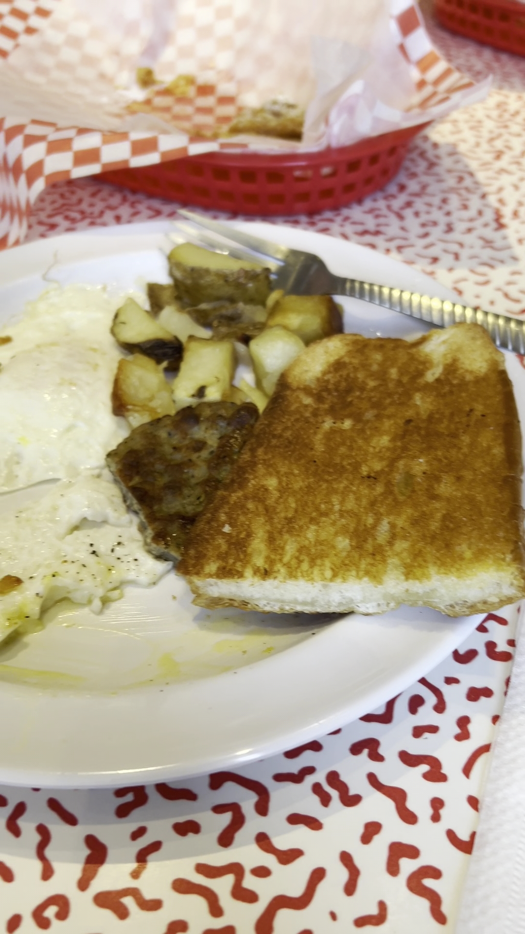 The French toast was perfectly golden, with a slight crisp on the edges and a soft, flavorful center that was rich but not overly sweet. The bacon was cooked to perfection—crispy, savory, and the perfect complement to the dish. The home-fried potatoes were a standout on their own, seasoned just right with a satisfying crunch on the outside while staying fluffy inside.