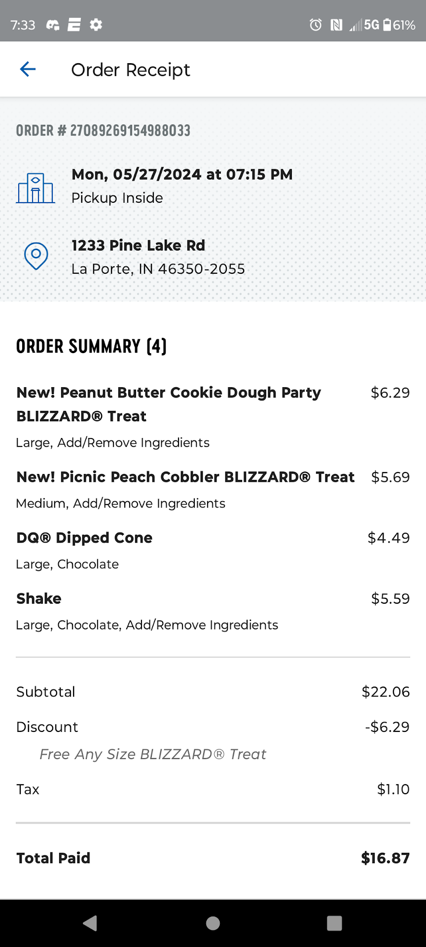 I ordered four large blizzards off the mobile app and the time said to be there at 6:56 PM, we arrived at 6:57 PM and our order was not ready. After 5 minutes standing there a young man asked us what we were there for and I said we’re here for our mobile order which we’re standing right under the mobile order sign and so he hollers towards the back of the kitchen that mobile order is here he waits about a few more minutes and hollers again before he takes it upon himself to go back there while he’s back there another young lady, who’s a coworker asked him if he was making them and he snapped at her with a bad attitude saying he’s making them And then after 10 more minutes so total 20 minutes we get the Blizards and they’re runny with not much of the “goodies” so mostly vanilla ice cream, but what’s worse is he makes them up and didn’t know which was which so they then had to take it back to the kitchen in the back there to figure out who’s is who’s. We (my husband and me) talk to the manager instead of offering any resolution or even apologizing, he just kept making excuses that they’re down two employees. I understand they’re down employees, but there was not only him that’s walking around and has saw us standing there and did nothing, but also the young man that finally went back there to make it wasn’t doing anything initially. Someone could have said we’re behind and apologized then let us know about how much longer our order would be. I love Dairy Queen but this establishment here at 1233 Pinelake ave, Laporte Indiana 46350...