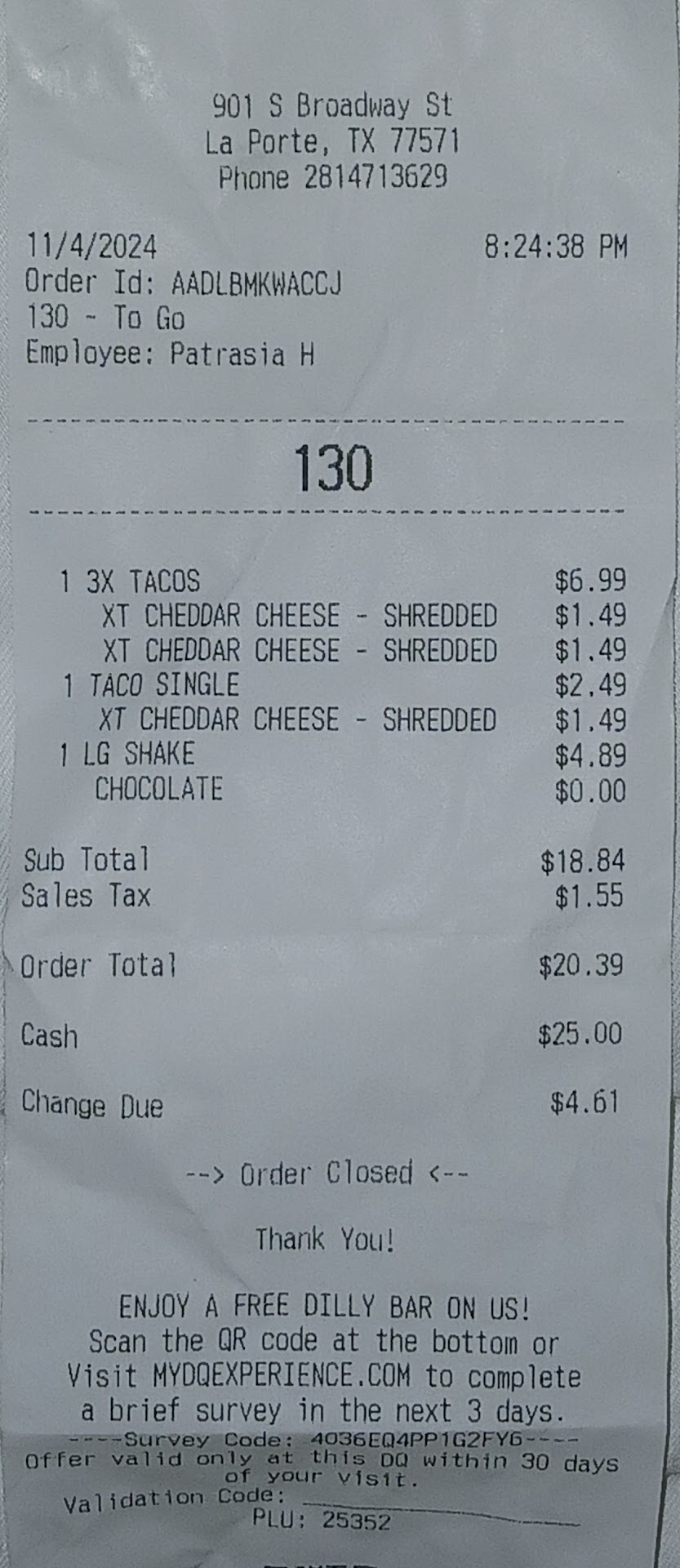 Read moreI have been coming to this Dairy Queen since I moved to La Porte in 2005, and I have never been disappointed a single time. The restaurant feels like a friendly neighborhood diner, not a sterile corporate fast food restaurant. Unlike most restaurants nowadays, the customer service is amazing. The staff all greet me by my name, and they all remember my order. Pat, the owner, always says hello to me, and I always enjoy catching up with her. Everyone is so friendly and so willing to help and answer questions. Nobody is defensive or rude, and everyone I talk to always has such a positive attitude. The food is absolutely outstanding as well, and it has been this way for the past 20 years. The food quality is top notch. You can tell that all the ingredients are very fresh, and it is very clear that all the food is prepared right when you order. The food always tastes good each time I visit, and this kind of consistency is so hard to find these days. I have never had an issue with my food, and all the food always comes out very quickly. I also love the overall environment of the diner. The music and the decorations make it feel very warm and cozy. Everything is also so clean. I never see any crumbs or wrappers on the floor or on any of the tables. Kudos to the restaurant staff for prioritizing customer experience by keeping everything so clean and organized. This Dairy Queen has been a valuable part of the La Porte community for over 40 years. You must stop by if you are in the area. You get incredible bang for your buck given the quality of food and customer service...