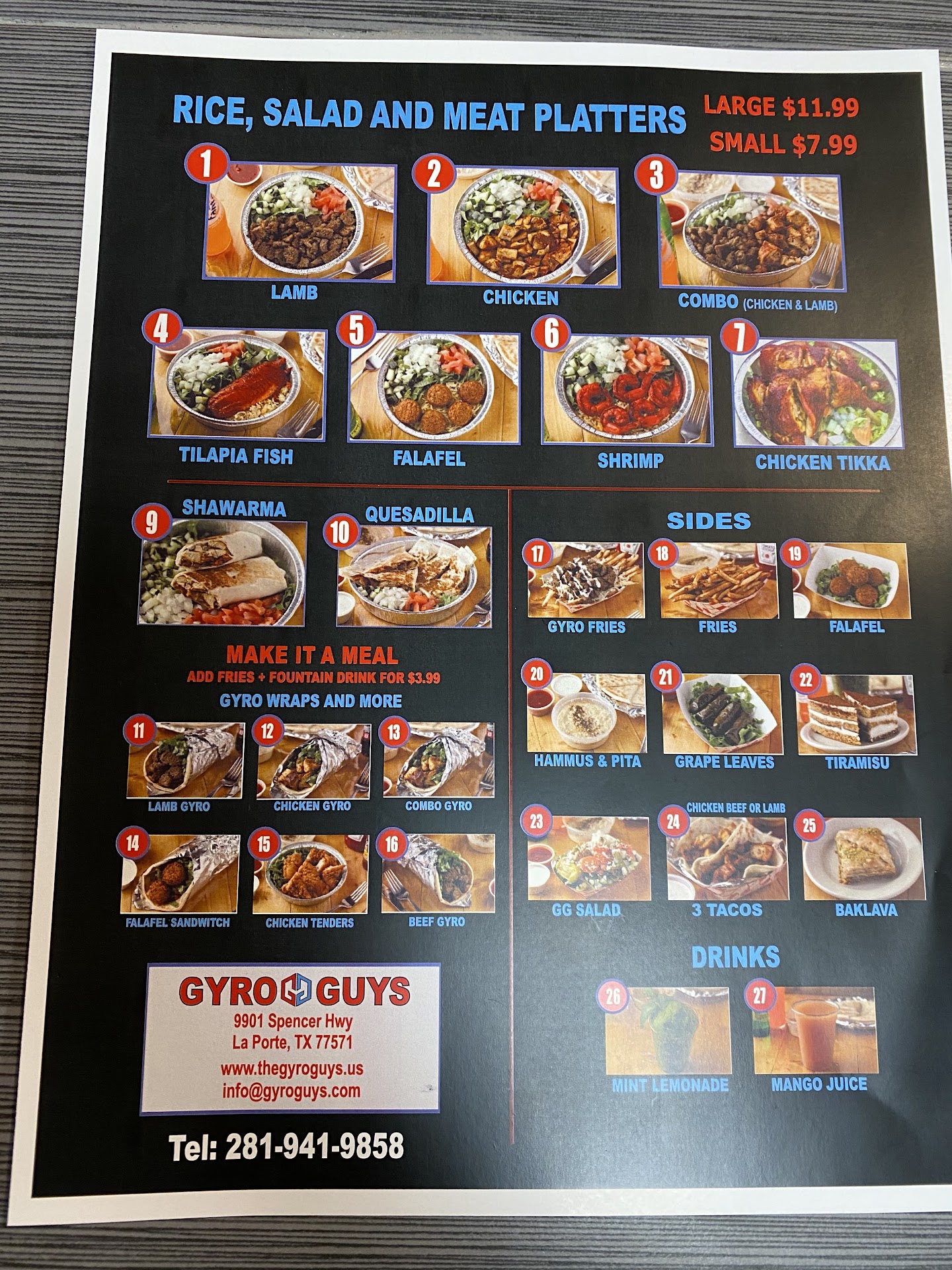 Read moreIn my personal experience, it has been quite some time since I have indulged in a Greek gyro. Today, I made the decision to visit Gyro Guys in La Porte. To succinctly summarize my experience, I would use the term "exceptional." I had been eagerly anticipating a gyro and am pleased to report that this was an unexpected delight. The superior quality, texture, and distinctive flavor of the succulent lamb/chicken platter, complemented by tzatziki sauce, vegetables, and a side of pita bread, were truly remarkable.