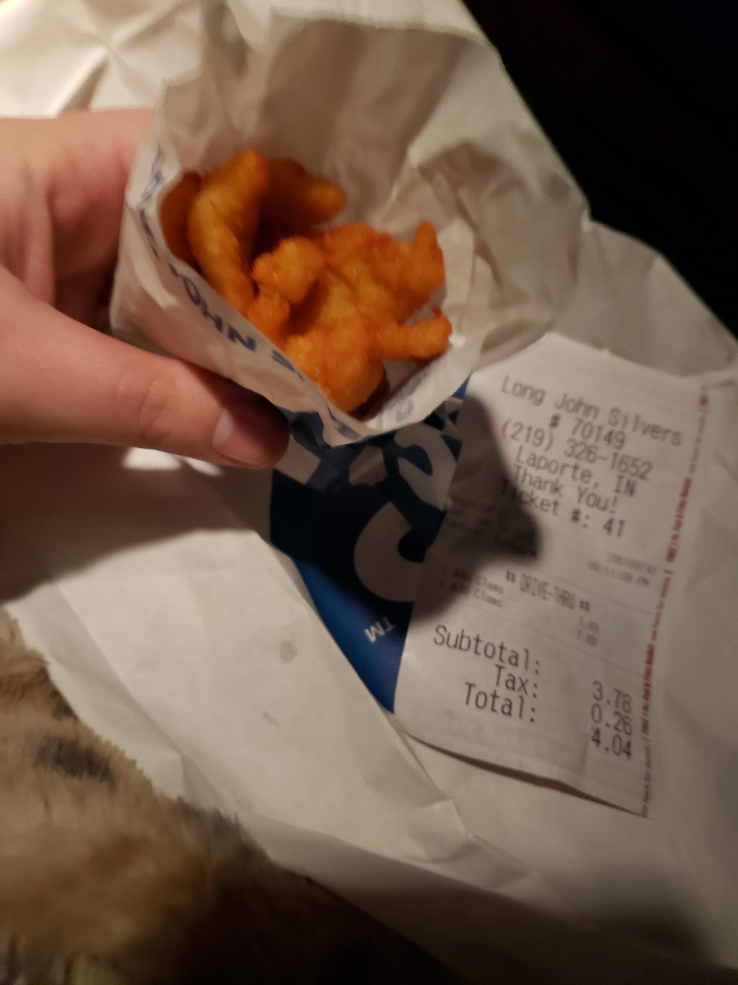 Read moreMy husband asked if I wanted to order dinner from Long John Silver’s in La Porte. I was surprised because 3 years ago he found a hair in his meal and has not eaten there since. I like the fish, so I said yes to dinner. He went to pick it up. He pulled up to the drive-in window. There were no lights on but he tried to place his order. They said he needed to pull up to the window to place his order. He ordered 3 Fish meals and one 3 piece chicken meal. When he paid he asked if he was receiving 3 fish and one chicken meals. When he got home, he had 1 fish meal and 1 two piece chicken meal. When I called and spoke to the manager, she seemed in a daze. I was very nice and tried to explain to her that we didn’t receive what we ordered. She hung up on me. When I was eating the batter crumbles, I found a hair. No more. Yeah they lost 2 customers today. You lose your business one...