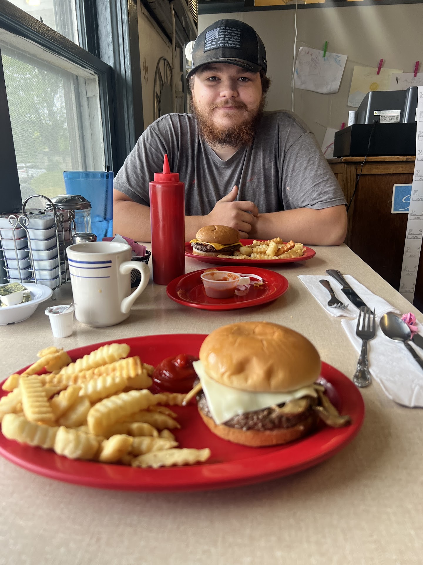 Normal portions, bland food, subpar service, high than normal prices for a small cafe. Or a very welcoming environment. The attention goes to all the older & local business. Gravy was watered down and lacked the flavor. Simple requests seemed to be bothersome to the waitress who also complained quite a bit.