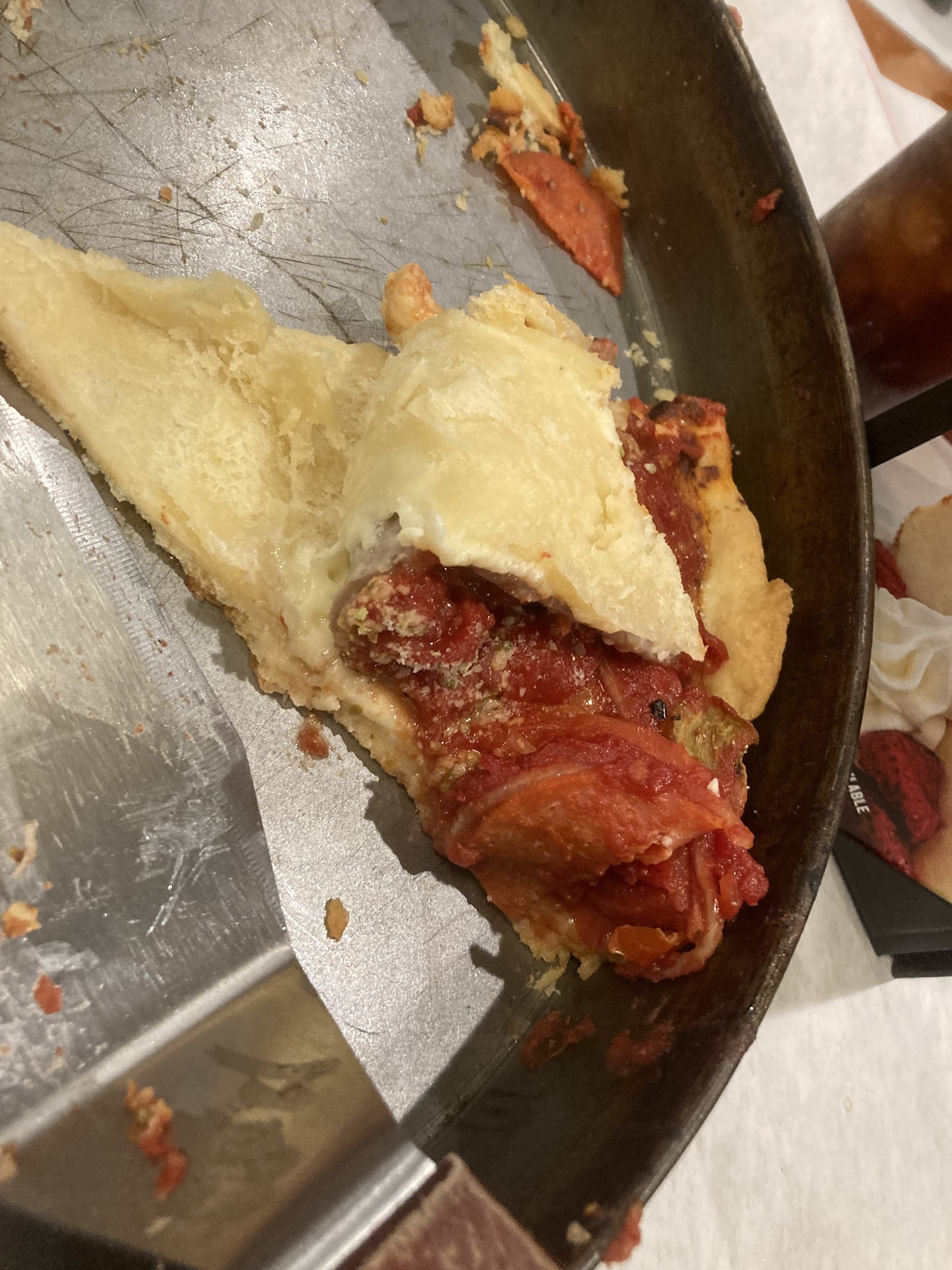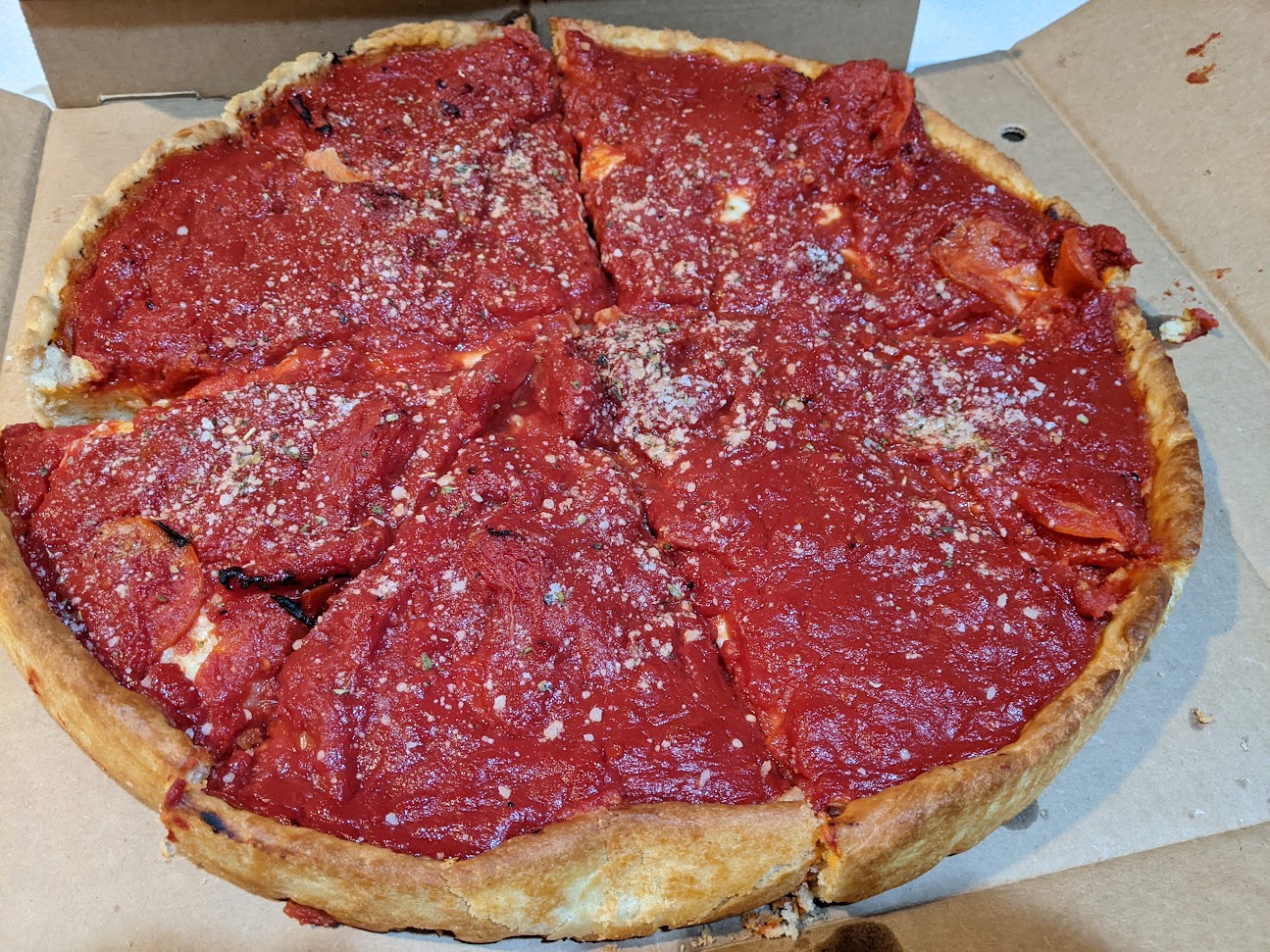 Unfortunately the pizza was AWFUL. Possibly the worst pizza I've ever had. I love this style of pizza, but this was poorly executed. The tomatoes were mostly whole and were entirely unseasoned. It was like popping a can of whole plum tomatoes from the store and digging in with a spoon. There was soooo much of it. Then, there was almost no cheese. The cheese that was there was nearly solid, and no melty cheese at all. The crust was mostly underdone and the pepperoni was totally floppy and had no flavor. It just tasted like tomato pie. That being said, we couldn't even actually eat our "free" pizza.
