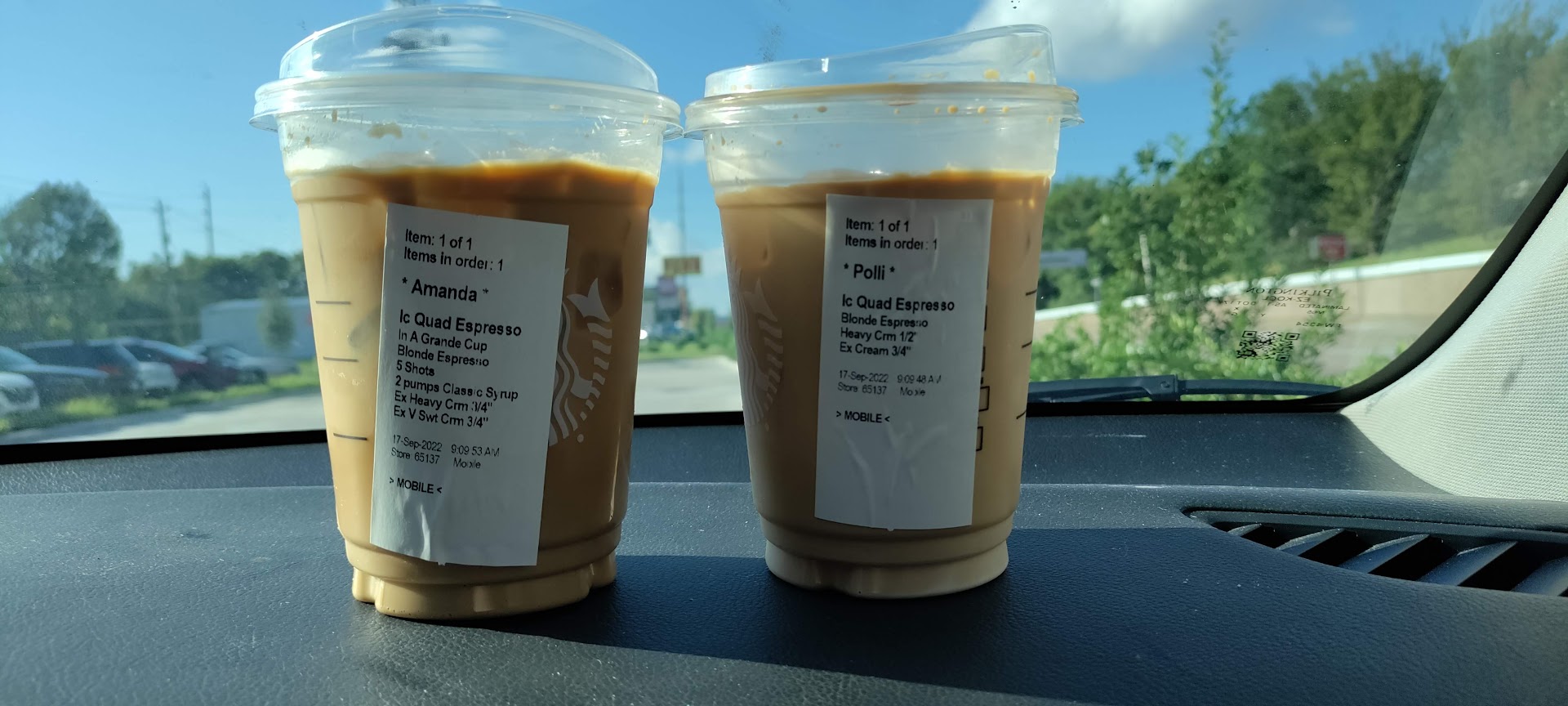 I ordered through the app: a quad iced espresso, in a tall cup with a splash of half and half and a splash of heavy cream. But the app doesn't print my order to say that. It never prints "tall cup" and always puts 1/2 or 3/4 cream (still confused by that... Is that inches!?! 1/2 a cup?! )