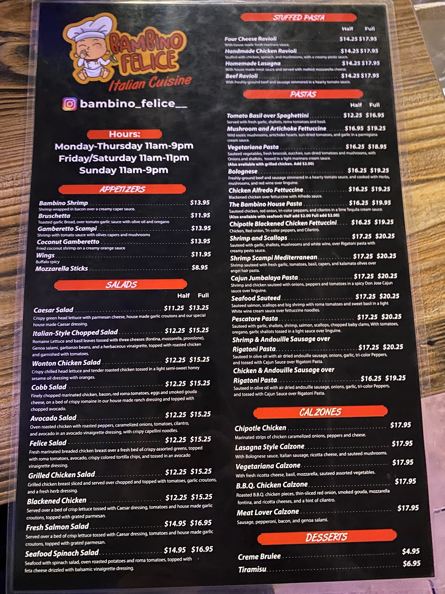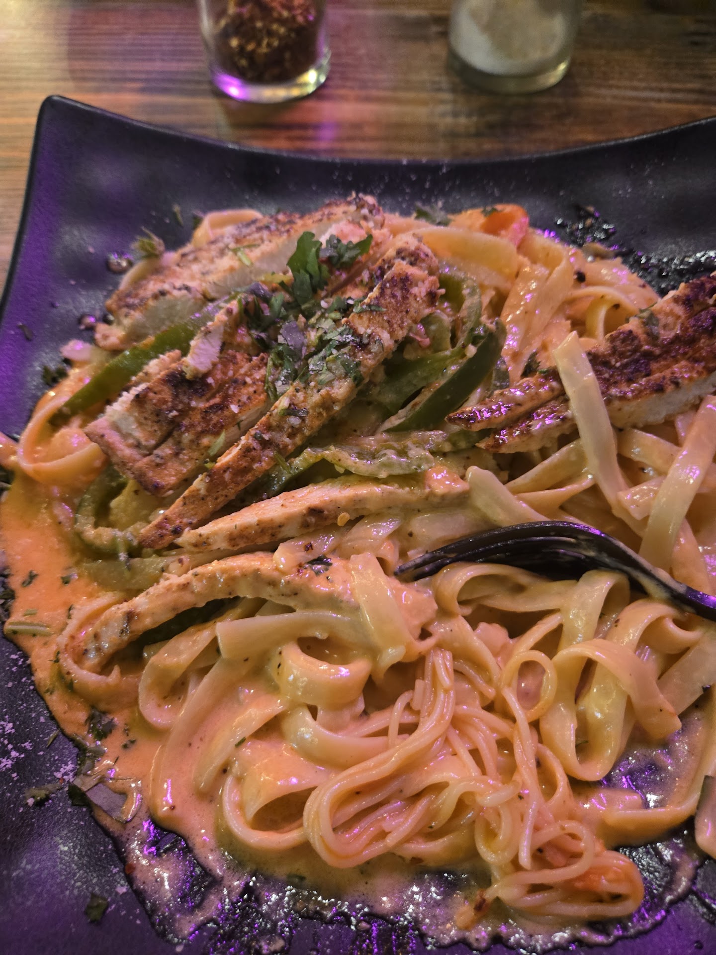 Our group ordered: the bambino house pasta, cajun jambalaya pasta, shrimp pasta and bambino house pasta with no meat. The reviews were mixed. Some liked it and others felt the sauce was blend and not creamy enough. The bread was hot and fresh. The food took a very long time to prepare. Don't come here hungry. It was well over 30 minutes. I suppose the extra wait time is for people to drink more as this felt more like a bar then a restaurant. Unfortunately we don't drink so it was just a long time. Also the music was really loud so it's hard to carry a conversation with the whole table.