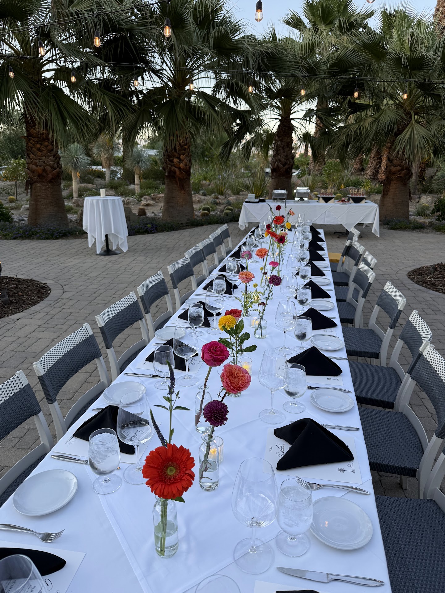 The patio itself is gorgeous. It’s surrounded by lush desert landscaping, which creates a private and peaceful feel. What really stood out to me was the lighting. Between the uplighting on the plants, the natural light from sunset, and the soft candle glow on the tables, everything looked magical. I’m pretty picky about lighting and ambiance, and it completely exceeded my expectations.