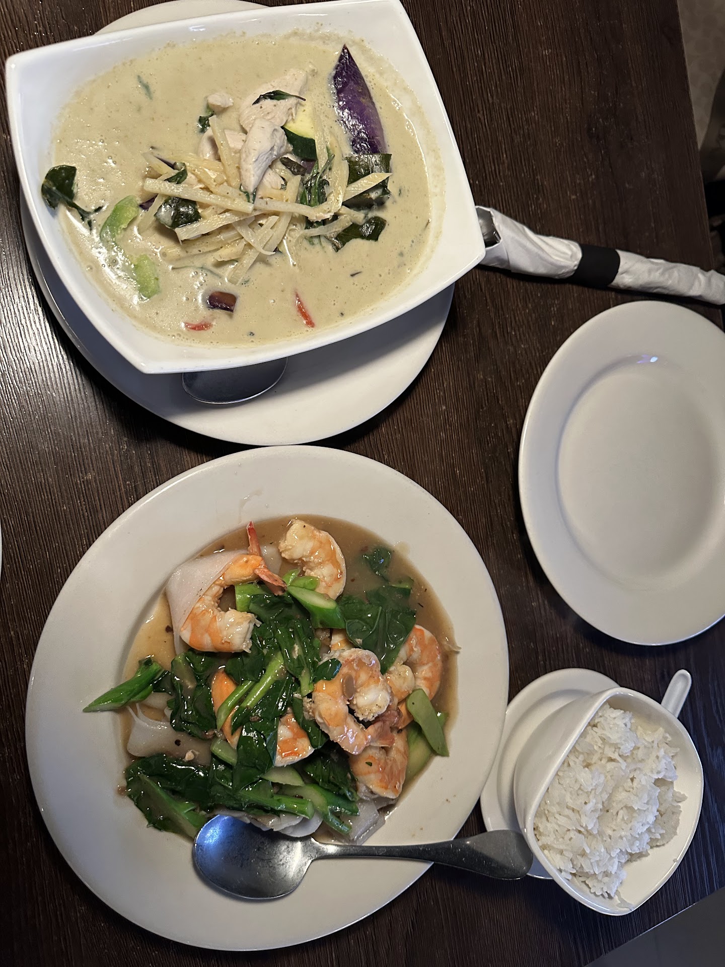 Business was super slow and the place had one server and at least one person cooking, so we were surprised at how fast the food came out after ordering. We order the basic Pad Thai and Panang Curry with chicken. We also had a cup of Tom Ka Kai. Later the server brought out some sauces (one home made) to add, after my partner asked for it. The home made one was HOT but very yummy. Actually, ALL the dishes were delicious and my partner's quest for the taste of Thailand as she had it in Chang Mai years ago, was fulfilled. Both of us were really happy we ate here.
