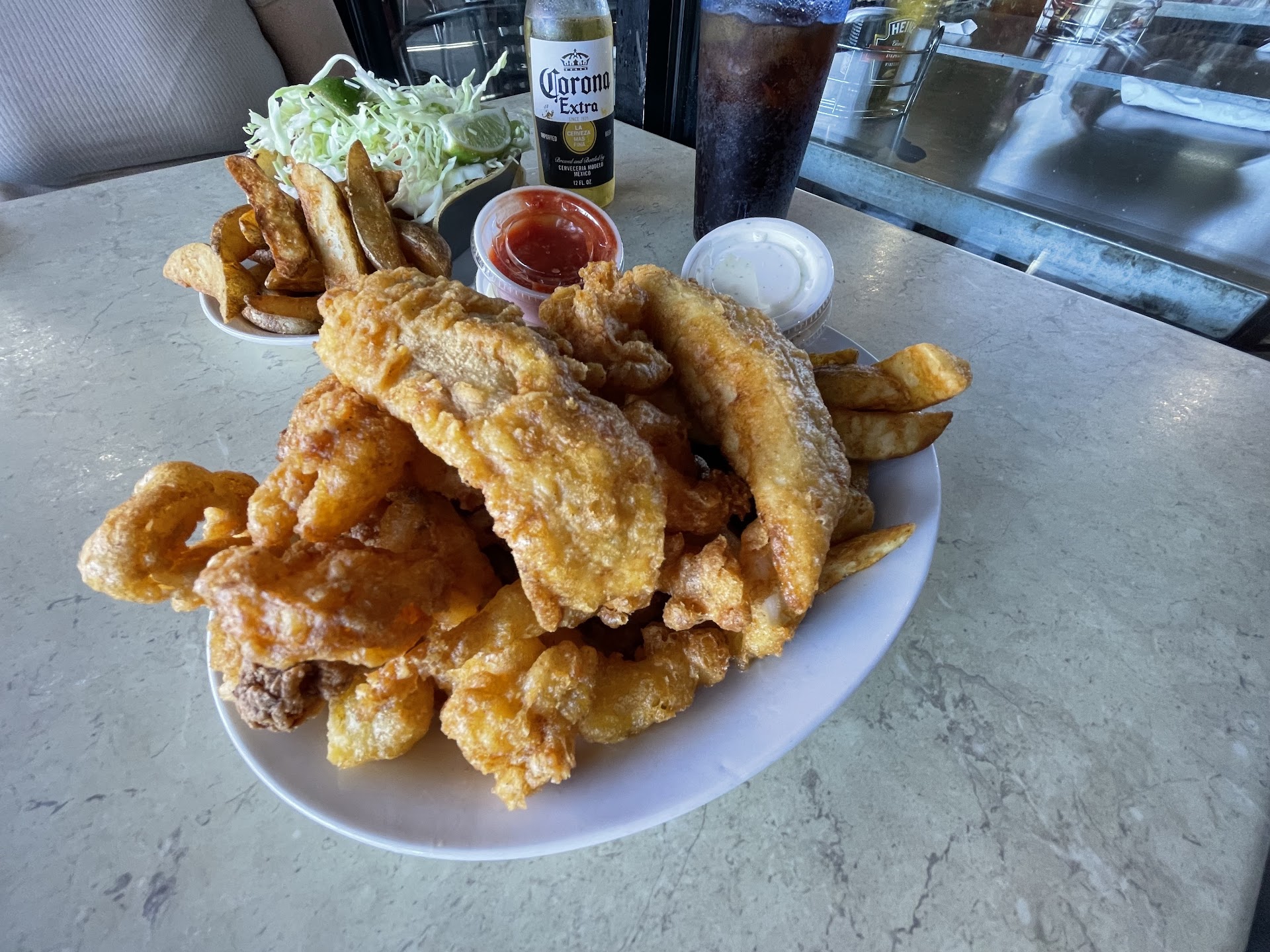 Read moreGreat fresh fish. Fish tacos were great, especially the classic ones! We sat outdoors on a Sunday evening and it was very comfortable in the shade with the misters occasionally misting. It was crowded and you order at the register, but they made sure there was a table available once we ordered and paid. We were a party of 6 so that was really nice. Coleslaw was especially fresh and delicious. Regular fries are pretty highly seasoned, not terribly kid-friendly. Rice pilaf was tasty, but the sand dabs I had been looking forward to were just okay. Fresh and nicely sauteed, but no seasoning or sauce at all, so I improvised with extra lemon and some salt. The kids "noodles" were just that: noodles with a little butter and a sprinkling of parmesan - really perfect for our less than adventurous 4 year old. Very comfortable restaurant for a family but you can get really fresh and wonderful grown up fish and seafood of every kind imaginable along with a nice glass of wine. We'll definitely be back. The only thing making this 4 instead of 5 stars was the service at the register - the gentleman who helped us was gruff and impatient - and the table servers were competent but not especially attentive or friendly. Maybe we caught them in...