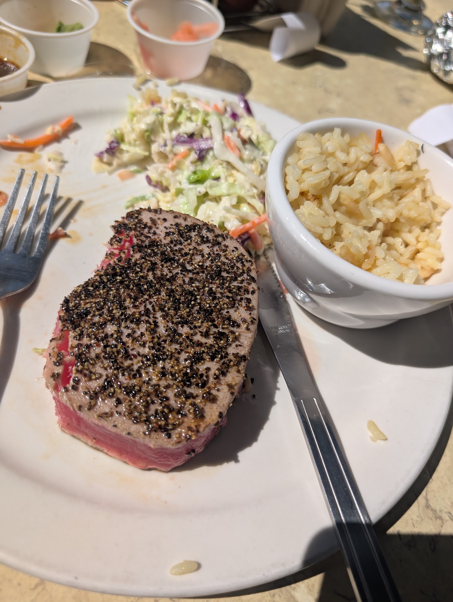 I like my Ahi Tuna seared with a pepper corn coating. As an option you can get it without the pepper corn. Grilled and Cajun as well but for myself, searing a nice Ahi Tuna steak is really my only way to have it prepared. The seared Ahi Tuna is served with fermented ginger, wasabi, and soy sauce. The sides include coleslaw, a nice rice pilaf, and french fries are another option.