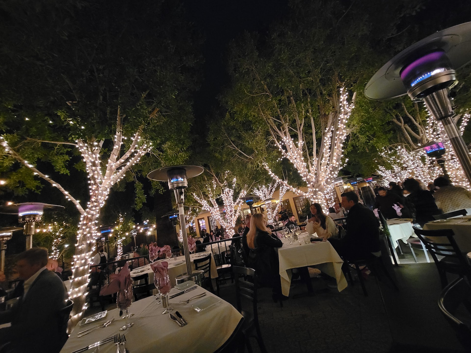 AMBIANCE: we were about 30 years younger than the rest of the patrons. Lights on the trees outside were pretty, but the live (again old school) music being sung and played by a single guy and his keyboard PLUS the bland, generic food reminded me of being at a bad wedding!