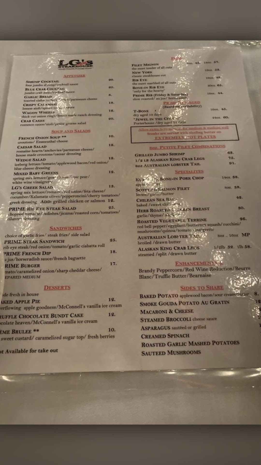 Read moreWe came to LG's after a terrible experience at another restaurant where the manager was so rude we had to walk out (Morgan's). We were greeted with such friendliness and caring that we knew we had made the right move to come here. From the minute we walked in, everyone was so nice and welcoming. Our waiter did a great job and our food was perfectly prepared. We marveled at the fact that they got five dinners served, piping hot and all of the meat was at exactly the temperature that was ordered by each one of us.