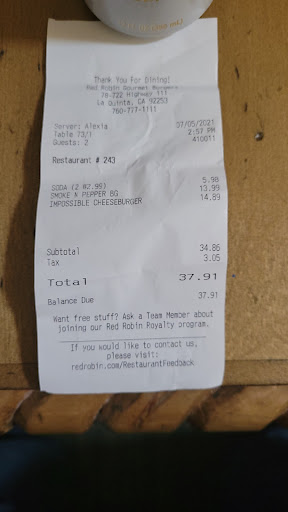 My wife and I have been dining at Red Robin in La Quinta for years. It is always a fun experience, and it is our 'cheer-up' place with all of our favorite 'comfort foods.'