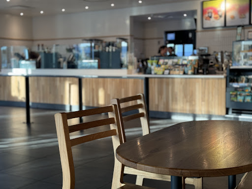 This location stands out a little, it still has seats around small tables, a community high top and one or two padded chairs. The wi-fi is still free and there are a pretty good number of electric outlets. But its all-neutral colors and hard edges. And a not too easy drive-thru lane.