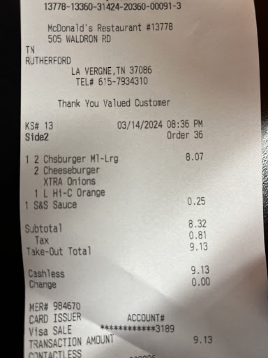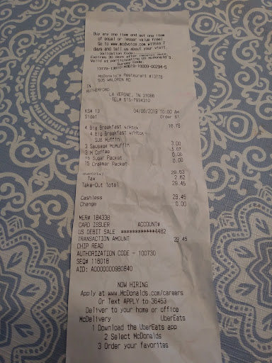Read moreHave to say I absolutely despise this McDonald's. I wish there was a way to give this negative Stars! It's not worth giving this McDonald's a star. My girlfriend is a big fan of McDonald's breakfast and goes there every weekend. I'm talking her into not going anymore, due to every weekend they mess up on this order! This is a receipt from today it's almost comical how they messed up every weekend lol... Last week they gave us 3 small coffees that we're supposed to be medium! This week they completely forgot the hash browns. So I went into the store like I do practically every weekend! Said you guys forgot something I ask for manager. She first was rude, which I was surprisedđ I told her there are four hash browns missing. She rolled her eyesđ¶ then she went and grab three hash browns. I said excuse me but there is four. I ordered for big breakfasts, she grab the receipt from my hand and looked at it again and rolled her eyes againđ and grab the other one and tossed it in the bag like she had something to prove!đ I simply got mad at that moment! I said thank you for doing your job. She then got mad. And got loud and said don't you start, for all customers to here. So she can look like a strong woman I guess LOL. Which I don't think she should be mad at me she's a manager that messed up. Don't be rude and roll your eyes at a customer. I don't care how hard of a day you're having. I don't do that or act that way in my job, nor do I expect someone to do that to me. I suggest if you're a manager don't roll your eyes at customers and be rude just do your job!! When they simply asked for their food which they ordered and paid for. Also when I got back took a bite out of one of the eggs realized it had a hair in it. Just another reason why I don't need to go back to this...