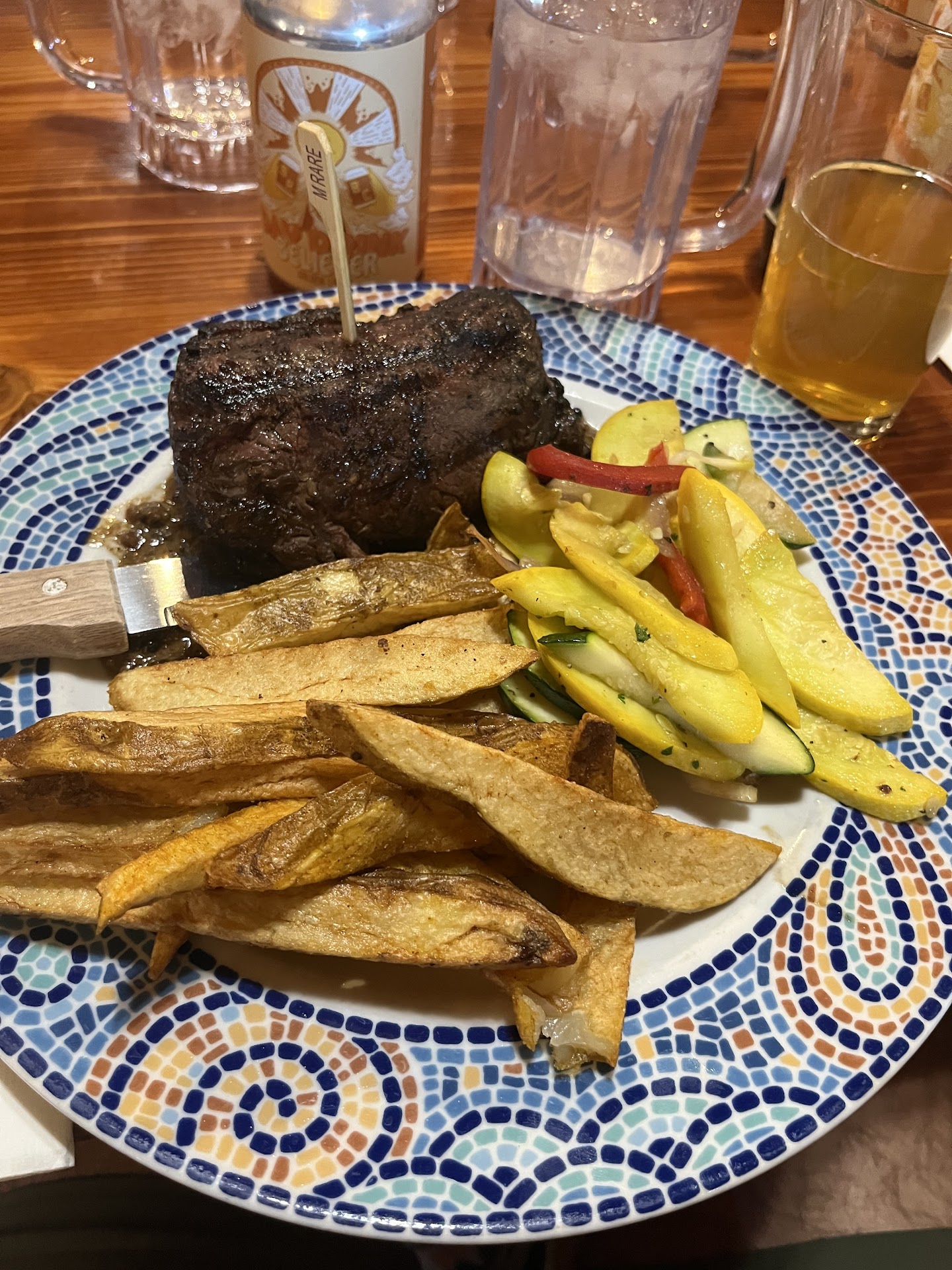 The real disappointment was the cowboy ribeye. At $48, described as hand cut, I would expect a pretty good steak. But this wasn't. I routinely get better ribeyes at Texas Roadhouse for half the price. Half my steak was VERY gristley. I could hardly chew it, despite it being cooked to apparently the correct temperature. And it was not really adequately seasoned. It wasn't inedible, but I get better quality steak at the grocery store. I would suggest that if you are hand cutting it, you should be able to identify the quality of the cut. I can, and I'm not a chef. I'm not saying they shouldn't serve steak. Just that if this is the steak you serve, you should not be charging $48. I also ordered it with sauteed mushrooms as a topping, which never came. But that's par for the course at every restaurant nowadays. I haven't eaten anywhere that hasn't missed something in a very long time.