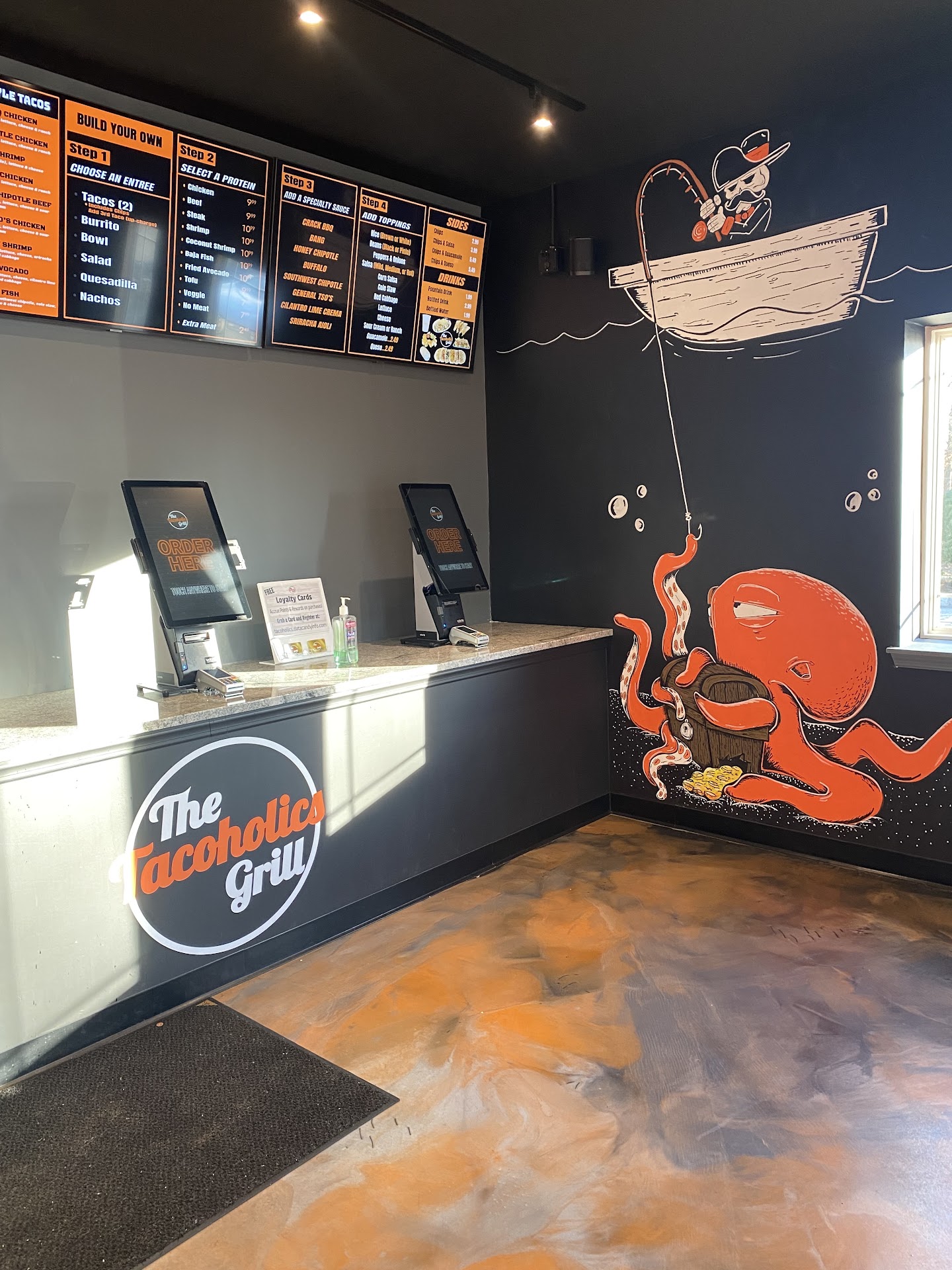 Read moreOk let’s break it down 1st Impression is they spent a good amount of money on appearance because it is a cool vibe when you come in. The floors are epoxy and have a cool orange swirl which is hot. It is super clean but after that you are on your own to figure out how to order. They have tablets to place your order but it just doesn’t feel right. They have a counter but there is absolutely NO ONE in this place to greet you, help you or just reassure you that your order will be completed after you pay. Once I paid and walked around to see if there was anyone in the place a young man came out and I asked him if I could confirm that my order was going to be as the menu stated as it wasn’t really clear when I ordered on the tablet. He confirmed my order and then went behind a wall and said he would be back. As I waited…. Alone….. I snapped a few pics of the place. My order came out fairly quickly and I took the food to go. I got the fish tacos which were good. They are definitely not your typical street taco or Mexican taco but they are ok. The burrito was good…. It’s kind of hard to mess up a burrito! Overall it was an average taco. I would try it again but it’s not one of my favorites in terms of all around experience. This place needs some customer interaction and maybe a TV or something to make it less cold and robotic. Best part to be honest was the cosmetic look of the place…....
