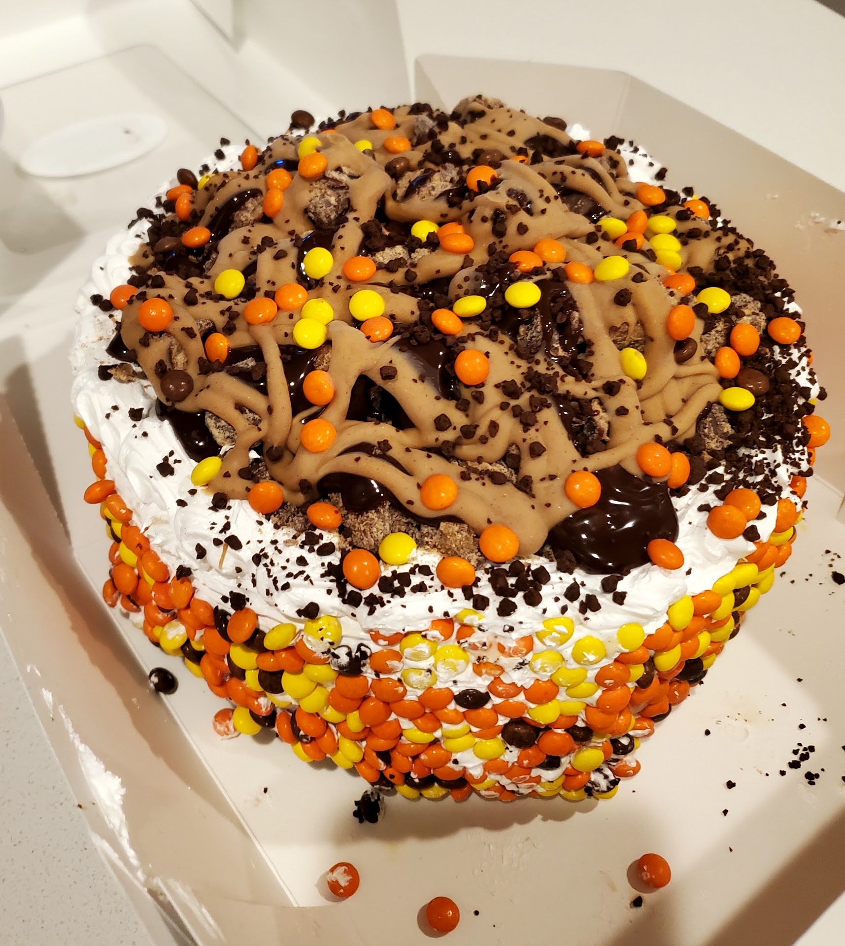 I ordered a custom icecream for a special occasion. Cake was made exactly to my request, everything from the different layers, icecream flavors, & toppings. Everyone enjoyed the cake and asked, where is the icecream cake from? If you have a peanut butter lover in your life, I highly recommend this peanut butter themed icecream cake. Aside from this custom order, we are regular customers. The icecream sundaes are our favorite. You always get good portions (scoops) served. The medium is almost too much for me. That's a good thing. Chocolate Chip Mint, Hot Fudge, Whipped Cream, and topped with M & Ms is...
