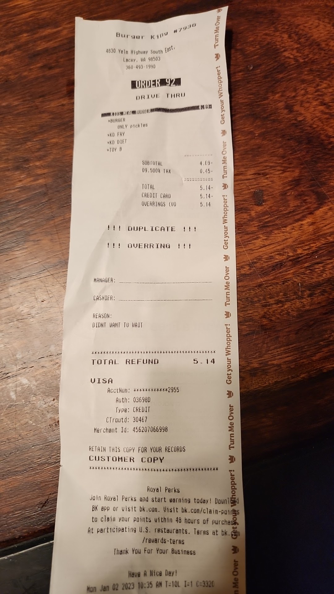 Read moreStopped at this Burger King later in the evening when there was no drive-thru traffic. We could barely hear the man over the speaker (or at the window), did not have half our order repeated back to us, when requested a cold brew with soft serve, the man said he could do it and stated our total. When we got to the window, we asked if we could make something a meal as it would make it cheaper, he said it would. The receipt he gave to us afterwards was $5 more expensive than what it initially was, as he had added an extra drink, an extra fry, and proceeded to not give us the extra drink, and ignored our inquiry as to why it was more expensive. Considering there was no drive-thru traffic, and no indoor dining, and our order wasn't big at all, I don't understand why it took nearly as long as it did for them to give us our order, and it wasn't even correct. They gave us two drinks, one of which was wrong, and when asked about the cold brew that wasn't listed on the receipt, the man asked if they could just make it a frappe instead. When asked if we could get a strawberry shake instead, he said they were out of strawberry. At this point and beyond frustrated, we just went home. We got no napkins, no straws, no sauces requested, and a burger we requested with no tomato or lettuce, had tomato and lettuce. In general a...