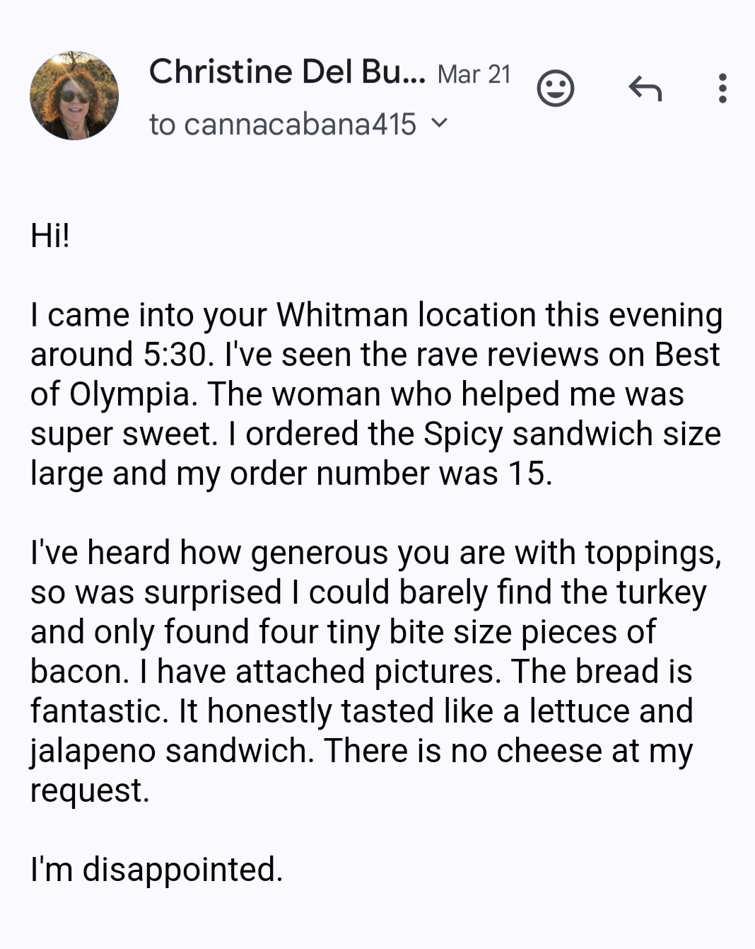 Read moreI ordered a large Fire sandwich to go on a Friday evening around 5:30. There were three people ahead of me waiting for their orders, so I expected to wait a bit. It was 30 minutes before I got mine. I was excited to try this sandwich I heard so much about: delicious, stuffed with meat, etc. I put half in the fridge and unwrapped the other half. I expected it to be squished, but did not expect it to be so thin, even though I ordered without cheese. I opened the sandwich and there was lettuce, lots of jalapenos, a 1-inch piece of bacon, and a small amount of thinly sliced turkey. I unwrapped the other sandwich and found it was the same except for it had 3 small pieces of bacon. Everything was drowning in mayo sauce. I was so disappointed. I rewrapped the other sandwich, and ate the first one. It was ok. Bread delicious as advertised, but overall it tasted like a mayo, lettuce, and jalapeno sandwich. I did not want to call them out on social media and you cannot FB message them so I emailed pictures along with telling them my experience. I heard nothing back. I finally replied to one of their posts and got a snarky response. When the owner realized I was serious along with me posting a picture, he said that wasn't up to their standards and I could call or come by to have my sandwich replaced. I thanked him and said I would come by the next time I was in the area. That next time was yesterday. I drove 30 minutes out of my way to come by after a Spring Break trip with my grandchildren. I introduced myself to the owner and he remembered me. He said I was supposed to call so we could talk and after reviewing the photos, there was nothing wrong with my sandwich and he would not be replacing it. Conveniently, the post where that discussion took place has been taken down. He also explained how many ounces of turkey go on each size of sandwich. I worked in food service many years and know my way around a food scale. I thanked him and left. I don't need my order replaced by someone who reneges on their promise to make things right, but I will surely make sure everyone knows my experience. Update: It looks like the owner is doubling down and calling me rude for not liking how my sandwich was made. I would love to see him post my comment from Facebook because I can't find it. I have my polite email. I stand by...