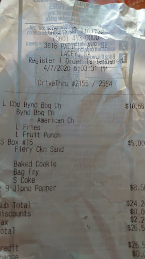 My mom was on her way home from work, very busy day so no time for cooking at home so she stopped at Carls Jr for a quick, simple dinner. Now mind you, my family and I have not had Carls Jr. since we lived in Dickinson, North Dakota 5 years ago and that place was actually good so we thought we would try it here since it had been so long. So, for starters, my mom said she’s glad she checked the food before she got back on the road because they forgot two of the chicken sandwiches. How..does that even happen? That’s TWO WHOLE sandwiches! Anyway..My mom got home with the food and it smelled good and we were all hungry, we each got what we ordered only to take one bite and put it to the side. The chicken sandwiches were super dry and zero flavor, my dad and I ordered the Monster angus thickburger, my dads sandwich tasted like they dumped the whole salt shaker on it, not to mention the grease literally running down his arms, while mine had no flavor and was dry with hard, tough buns, my mom ordered just a regular cheeseburger with lettuce, tomato and all the good stuff and hers didn’t even taste like a burger. It almost tasted like that vegetarian “impossible whopper” meat, ech, gross. And to top it all off, the fries were not only cold and sad looking, but they tasted STALE. $63 thrown away and 6 of us going to bed hungry. I wouldn’t recommend this place to my dead ancestors. Super...