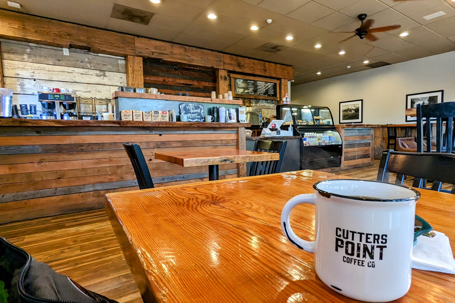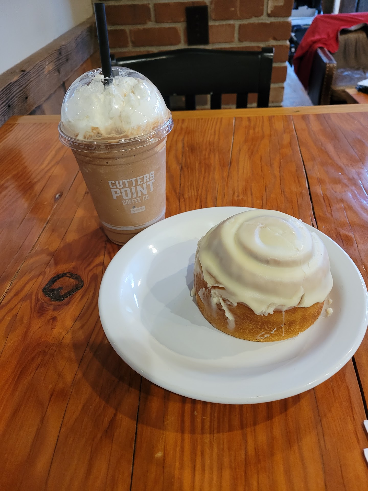 Pros: There is a drive thru portion & a sit down portion for Cutters Point Coffee and all I can say is wow! This place is awesome. There was only two ladies working today but they were so fast & efficient with making the coffees for inside customers & drive thru customers extremely fast. They spoke happily, not the fake sort of happy, but like they actually wanted to have a conversation with you and others who are clearly regulars. The conversations may be quick but they're great! I don't know how they do it honestly, I ordered my coffee, a 16 OZ blended Peppermint Mocha with 3 shots of coffee, & a cinnamonroll and within under 5 minutes of ordering they made my coffee.