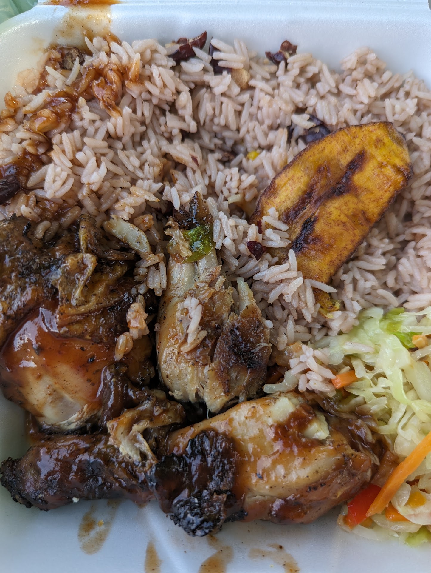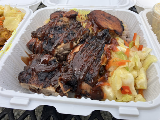 I got the jerk chicken meal, which came with coconut rice, cabbage, and fried plantains. My partner got the curry and jerk chicken combo, which also came with coconut rice, cabbage, and fried plantains. My favorite was the jerk chicken; hers was the curry chicken. The rice was cooked perfectly, and while neither of us are usually plantain lovers, we found that when eaten together, the combo was a symphony of flavor.