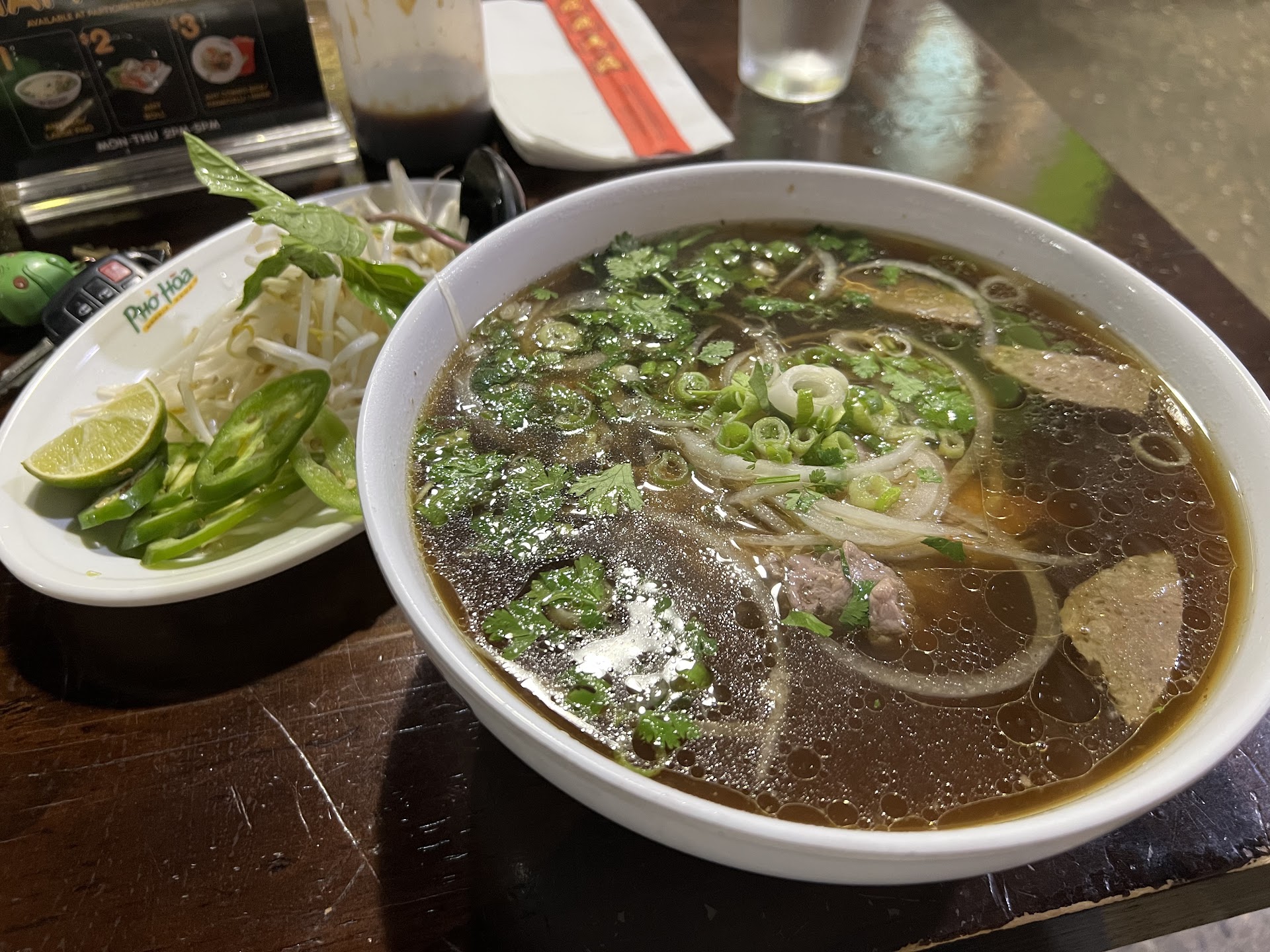 Read moreCool pho spot, open till 10:30 at night, prefect for late dinner eater like myself. I got the steak and meatball, which is my go to when I hit up a new pho spot, so I can have the same dish to compare. The broth is very flavorful and they definitely load you up with it! Everything else is kinda just what you will expect, I ordered a large but I think you still kinda just get a standard bowl size amount of noodles, I would say roughly 1 - 1.5 pack of ramen worth. (I do love noodles tho, so your mileage may vary). I also order a boba black tea milk tea on the side, not going to lie, generally pho place don’t have great boba (beside the ones that are part of some chain boba place like happy lemon) but dang, this one definitely take the cake on the worst boba I ever had, it basically tasted like water with non-sweet boba. Although, it’s the also the only boba place I have went that uses crushed ice, and I love crush ice so there is that. Overall, I will recommend the spot and will definitely go back. Their pho is great! Just avoid the boba and you will have a...