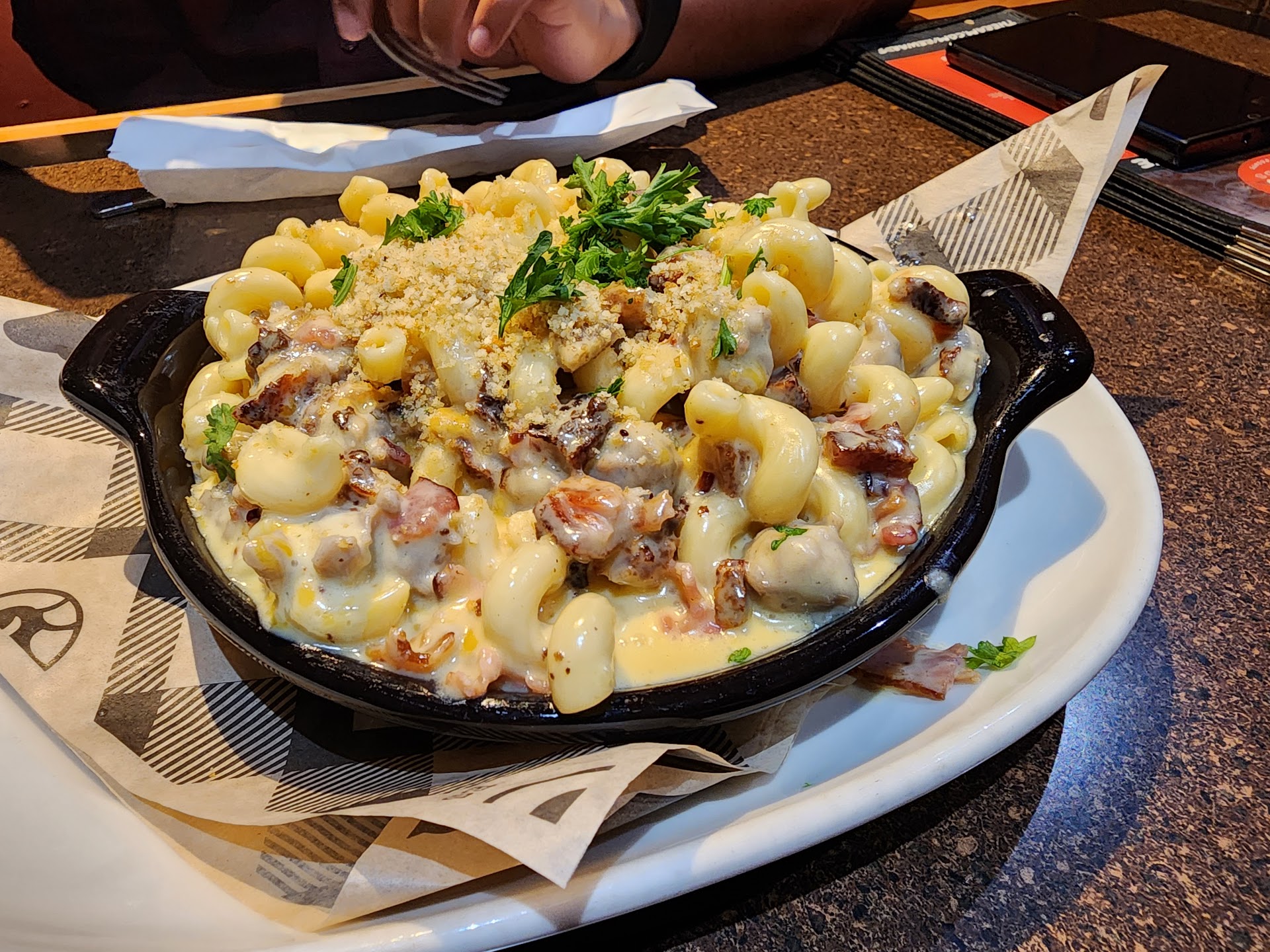 Their menu has a really good amount of options to choose from. My husband ordered the Hefeweizen beer and really liked the taste of it. For our food, we decided to go with some mac and cheese to share (we added pork belly, sausage, and bacon; each meat add on is a couple bucks each), my husband got the Santa Fe Rodeo Smash Burger (unfortunately they were out of smash patties but they gave him wagyu which he always likes), and I got the Focaccia Club with tater tots (small upcharge for upgrading to tots).