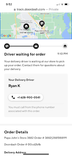 Read moreI ordered a Works pizza at 9PM with a quoted delivery of 9:40PM but each time I checked the tracker the delivery time expanded. Shortly after my order, I was notified that DoorDash would deliver my order. I didnât care who delivered, my order was with Papa Johnâs. I called the store at 9:40PM to see if the pizza was going to be delivered because tracker showed 10PM delivery. Fred told me the DoorDash person had been there and left without my order. Fred said he would remake the pizza and contact for another driver. The delivery time after the call moved 10:10PM on an original order time of 9PM. At 9:50PM DoorDash texted to ask how was my service when nothing had been delivered. At 10PM the driver showed at the location on the tracker with a 10:08PM delivery so I was happier then the delivery time passed so I called again at 10:10PM to ask what happened to get âits DoorDash they picked up the order 5-6 minutes agoâ so I cancelled the order and my money was refunded. Fred was good about the refund but the delivery system at this location is broken when depending on a 3rd party to deliver orders. To top it off, at 10:25 I got a text from DoorDash that my order was ready downstairs so I went downstairs to be greeted with a cold pizza and the driver said he had it for 28 minutes when the location was 7 minutes away. I was too frustrated so I didnât argue with him about delivering cold pizza. As stated earlier, Papa Johnâs owns this issue but it appears DoorDash is not keeping up their side of the agreement. Food for thought, last month in Indiana, during a snowstorm my Papa Johnâs order was delivered ahead of the time...