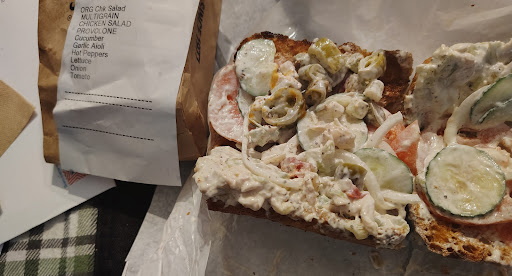 Read moreThe worst Chicken Salad Sandwich I have ever eaten. Absolutely disgusting. Not only did Potbelly forget to add provolone cheese and lettuce, the sandwich was overloaded with hot peppers and the chicken salad was completely bland. After I took the first bite (without checking), I realized how terrible it tasted, I opened the sandwich and saw the missing items and overkill on hot peppers. When I attempted to eat the sandwich, everything kept falling out, due to the sandwich being completely runny. Yes, I said "runny". I don't understand why the sandwich was so wet. I looked over at my boyfriend, as he ate his sandwich, and his sandwich was also runny. We are new to Potbelly, and don't know if all of their sandwiches are made runny or what. But we are definitely hesitant about coming back.