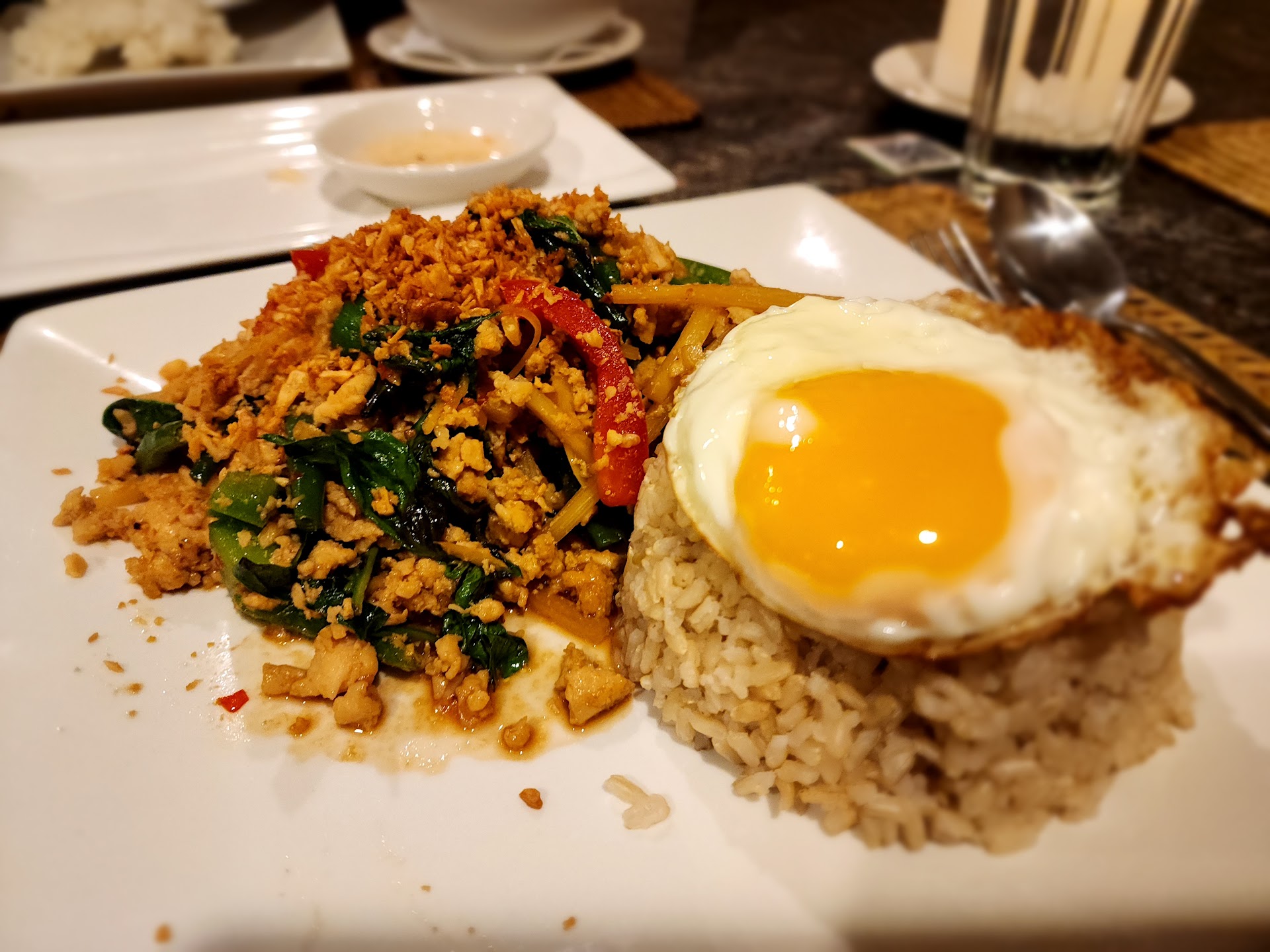 Read moreWe have been here before but believe the name and ownership az well as the menu has changed since the last time. Came on a Weds eve and were the only customers here. Ordered the Pad Kapow with brown rice , a very flavorful dish with ground chicken (would have preferred to know that), green beans, bamboo shoots and basil. Got medium which was tasty but not spicy at all. Brown rice is additional cost which would have been nice to know as it's printed for other menu items. My friend got some springerolls and their chicken massaman curry. Nice portions for both. Service was quick and efficient and the owner? was very nice. Like all places prices have gone up so it was over $20 including tip for my one dish. No drinks. I do wish their menu was a little larger to include noodle/rice bowl options but other than that it was a pleasant dinner...