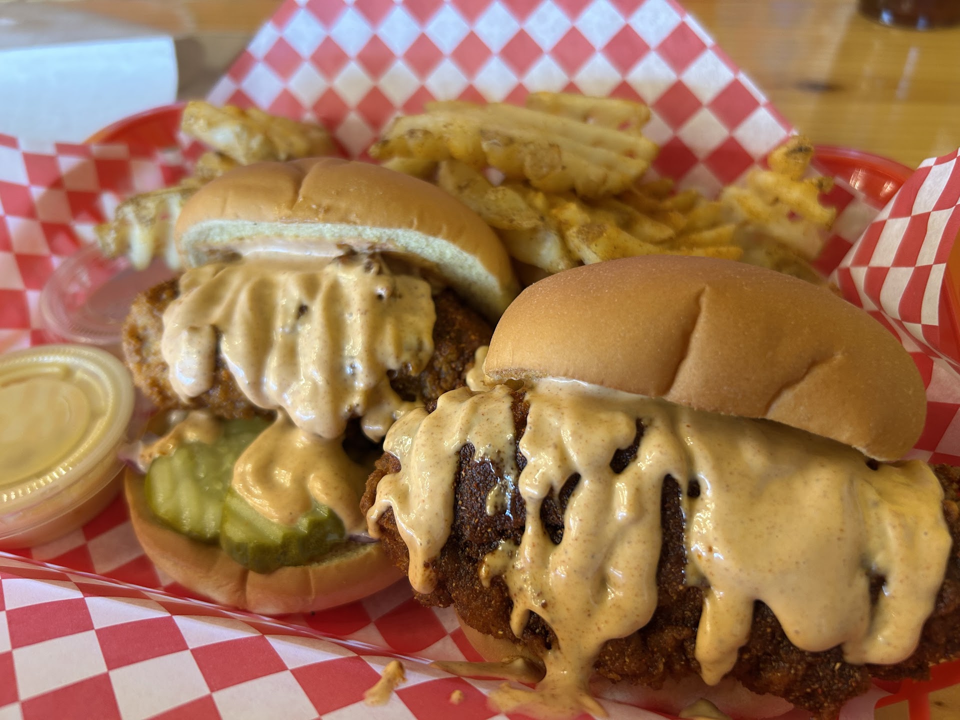 The chicken is incredible, well seasoned, moist and cooked perfectly. Itâs absolutely delicious topped with the house sauce and accompanied by the seasoned waffle fries. I started with Medium and as someone who has an affinity with spicy food, it wasnât that spicy but had a good kick to it. I will try Hot next time. The slider combo came with two sandwiches was decently portioned for the price.