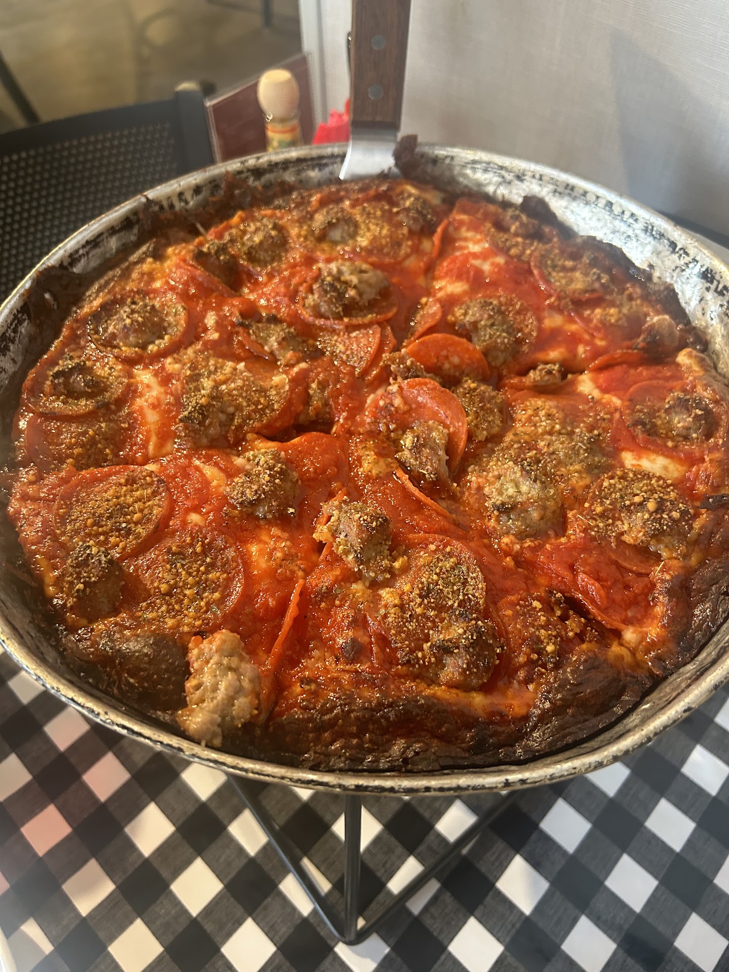 Read moreThe experience here was highly disappointing. First off this restaurant claims to serve Chicago style deep dish. Either they are not aware what Chicago style deep dish is or they lied. Chicago style deep dish is not a thick crust with cheese on top. This pizza was a very poorly made Detroit style pizza. There are several places in town that make this style pizza and make it actually crispy not just burn the end. The pizza tasted ok but the price was ridiculous. It would make sense for a real deep dish pizza but not for this style. I order a personal pizza. I also ordered to go. It took 45 minutes for the pizza. I was fine with the wait when I thought I was an actual deep dish but knowing this style take at the longest 25 minutes to make it was quite disappointing how long the wait was. I ordered to go and I came back to get the pizza I received no call or anything about it the pizza was ready. When I got there the pizza was barely warm. There pizza does taste ok but I have review many places here in Lafayette and they're not even close to one of the best. They actually on the side of one of bad pizzarias. I highly recommend not coming here especially if you want a real Chicago...