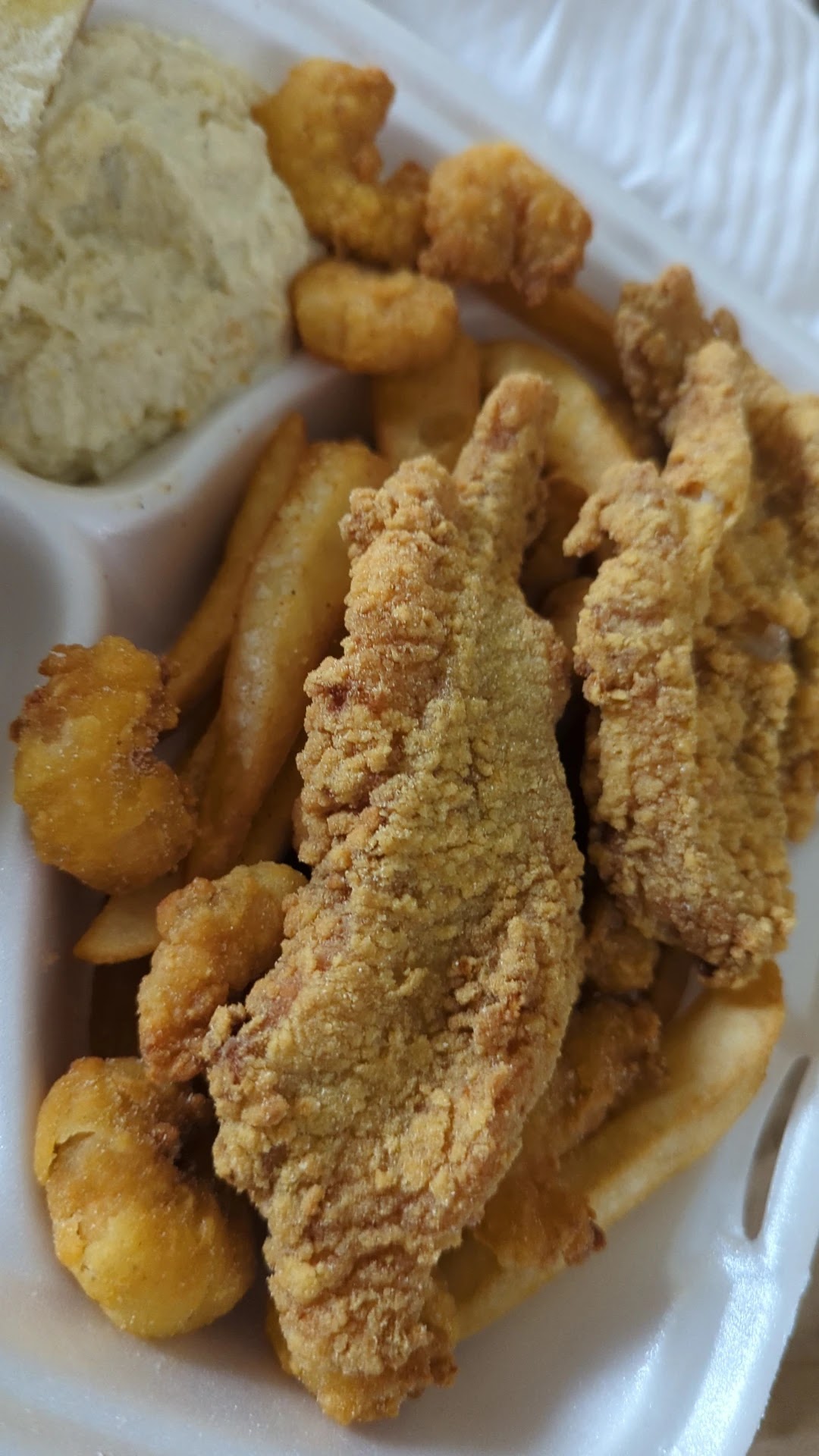 Generous, well-seasoned portions – The Large Seafood Plate (two catfish + 10 shrimp with salad, bread & choice of fries or fried rice) comes in around $13 and consistently satisfies .