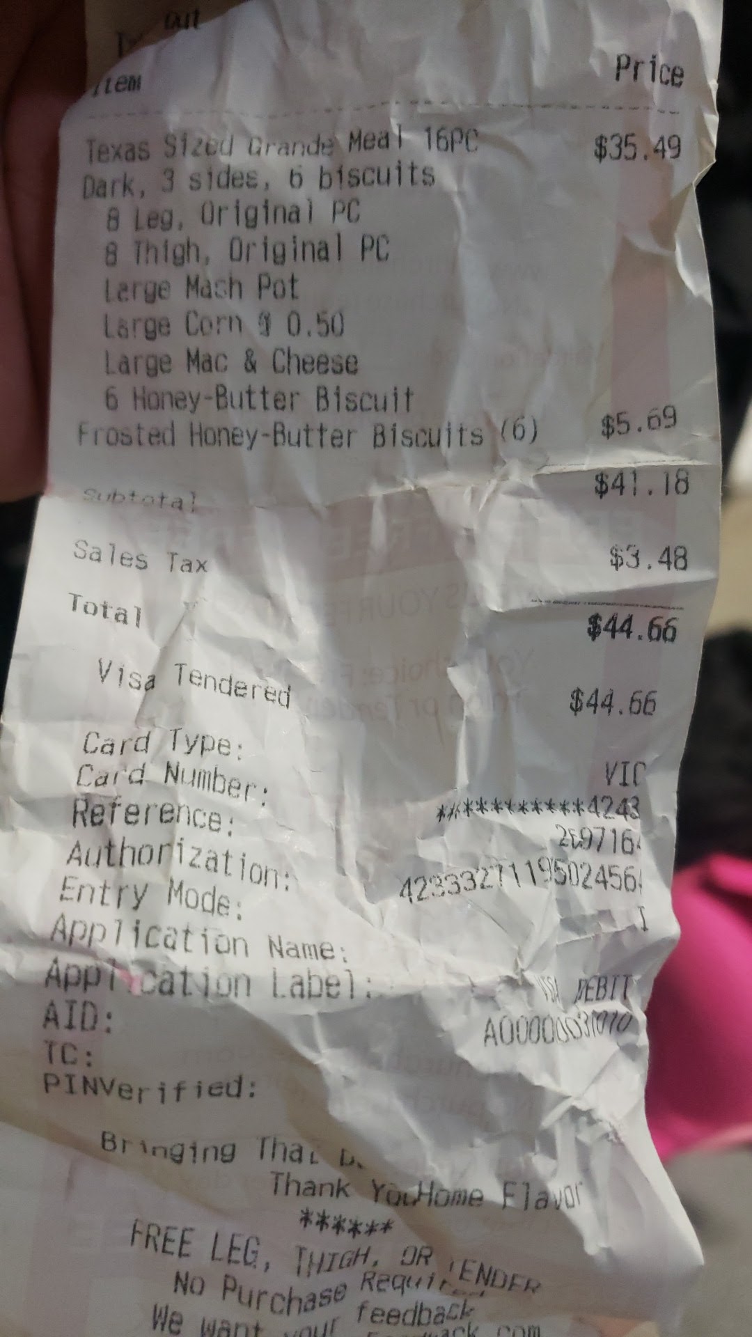 All I can say is absolutely unprofessional. I went through the drive thru and was greeted normally and then followed up with they are out of biscuits, tenders and jalapeños poppers. After hearing that I had to reevaluate my order which then I was rushed by the girl on the intercom. After telling her I needed a second I could hear her making a bunch of disrespectful comments. Even after all that I still proceeded to order the family meal when she cut me off to tell me they had a 15 minute wait on spicy chicken. That's fine, but I asked will I still be charged full price since they do not have any biscuits or would I be given a substitute. She told me nope, I still pay full price with no substitute. So naturally I questioned how that made any since and she got upset and said whatever and that I still had to wait 15 mins for the chicken anyway. I'm not sure what those 2 things had to do with each other but oh well. At this point you will never get my business and now I understand why this location is littered with...