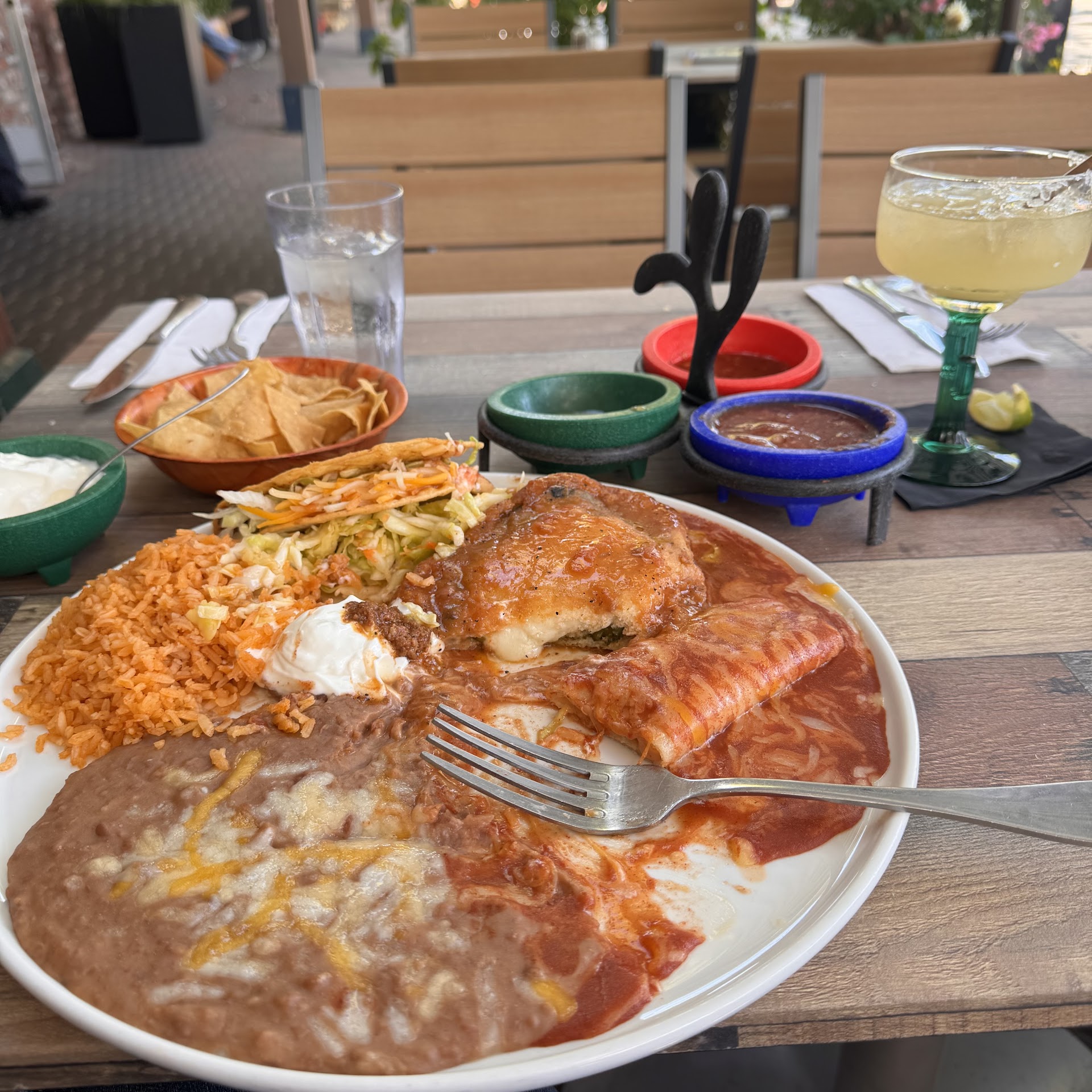 Read moreWe were excited to eat here for lunch he 1st time. The food was okay and the drinks were good. I will give it another try. Service wasnât great but it was crowded (after the art and wine fest). I found it odd that for a table of 4, they automatically included a gratuity (18%). Luckily I noticed, because when it came time to sign the bill had a spot for gratuity (with suggestions for 18, 20 or more). Note, it did not specify for âadditional gratuity). Probably by design as most probably donât check. I know my friend didnât notice and would have done another 18% on top had I not noticed. Also, someone at the table asked for extra cheese. They changed us $3.50 for that which was a surprise given it was never communicated....