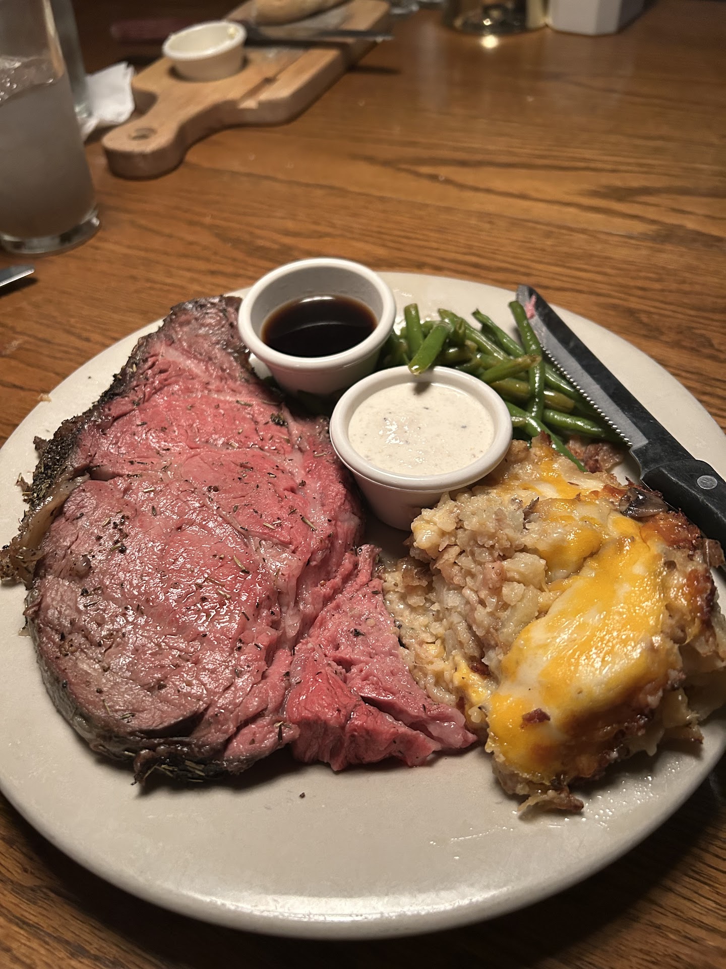 Read moreOur week had been a rough one with three deaths, an older friend and mentor, a younger cousin that cancer claimed at the age of 45 and lastly my mother. My wardrobe had needed updating such that my girlfriend had no idea that I truly did know how to dress outside of my trucking occupation and motorcycling hobby. My formal wear choices impressed her so much that she asked that after all the grieving had passed that we dress up and have a nice date together to which I agreed needed doing. The Mountain Jacks in Lafayette, IN to my knowledge had closed when the chain fell but the local owners had bought the menu and reopened almost without otherwise being noticed. On the way home from my mothers funeral it dawned on me that there was no time like the present to honor my girlfriends request. Without reservations we were told by the hostess that our wait for a table for 2 would be approximately twenty minutes which would have been very appropriate for a Friday evening at 7:00 PM. We were seated in the bar at a nice table in half that time. I should add at this point that my girlfriend is a medically retired server of over 25 years whom in her employment at the most renowned Catfish Restaurant in Indiana developed an International following and was very much requested by Racing Teams and Sports Dignitaries as they passed through Indianapolis over the years. We both are often dissapointed at the professionalism in serving having become almost a lost art. Our server was a woman named Julie that was very much on her game. We started our meal with the Crab Stuffed Mushrooms which were as good as any we have ever enjoyed. We both ordered different sized portions of Prime Rib with mine being the "bone in" choice. We both also opted for the tableside salad with loaded baked potatoes and steamed green beans as sides. As I mentioned previously, Julie was well on her game with her timing being flawless. Our entrees were to perfection with the prime rib being so tender I had trouble keeping it on my fork while dipping bites in the aus jus and horseradish. We followed our meal by sharing a piece Chocolate Mousse Pie which was exactly as rich and filling as promised. Neither of us consume alcohol any longer so our bill came to a tick over $80.00 and for the first time in a long time it was pleasant to leave a generous tip. All in all a wonderful way to end a very hard day and an...