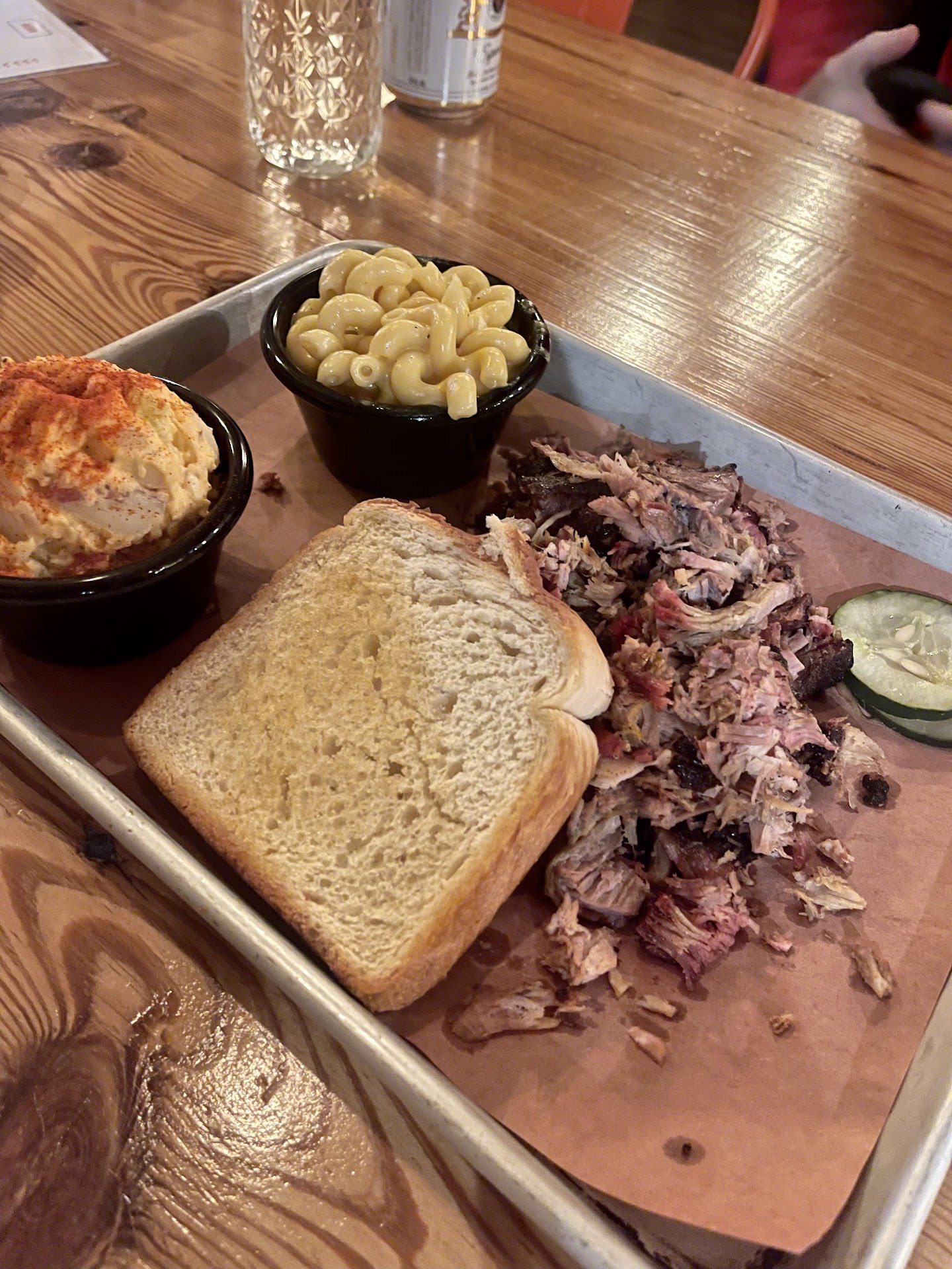 This place went above and beyond on flavor and service. The place fits perfectly for a bbq joint. Very rustic and warm and welcoming all at the same time. I placed an order to go for my husbands break dinner, which is important to note because I picked up at 7:45 and his break doesn’t start until 8:30. The food was still warm and fresh. For dinner we ordered the og with seasoned tots, brisket & Brie with Mac n cheese, side of greens, and cornbread, we also got a kids pulled pork with cornbread and sweet tea. The og sandwich was really good and went well with the bbq sauce and pickles, the pickles were flavorful but lacked crunch. The brisket and Brie was absolutely amazing. I got it without the onions. Only downside to the sandwich was the jalapeño jam wasn’t spicy at all so I was missing that note of spice, I also wasn’t able to get the white bbq sauce that is super popular and sells out fast so you definitely want to get there early to get some. Overall the sandwich blew me away and was a wonderful combo. I could eat ten more of those. The greens and Mac were super good. They had a lot of flavor. I could of used some vinegar for the greens. Those sides were a great portion. Enough for leftovers or to share. I also got the cornbread which was amazing but for 3$ I was expecting two slices and I only got one. For the kids meal they enjoyed the pork and corn bread. The pork was juicy and flavorful. Unfortunately they didn’t get their drink for their meal. Other than that the foods outweighed the bad and they definitely know their bbq. This will be our new regular when we come to town because they didn’t disappoint and I need another brisket sandwich. * note didn’t take pictures because it was to go and sat a while. So the pictures wouldn’t of done the...