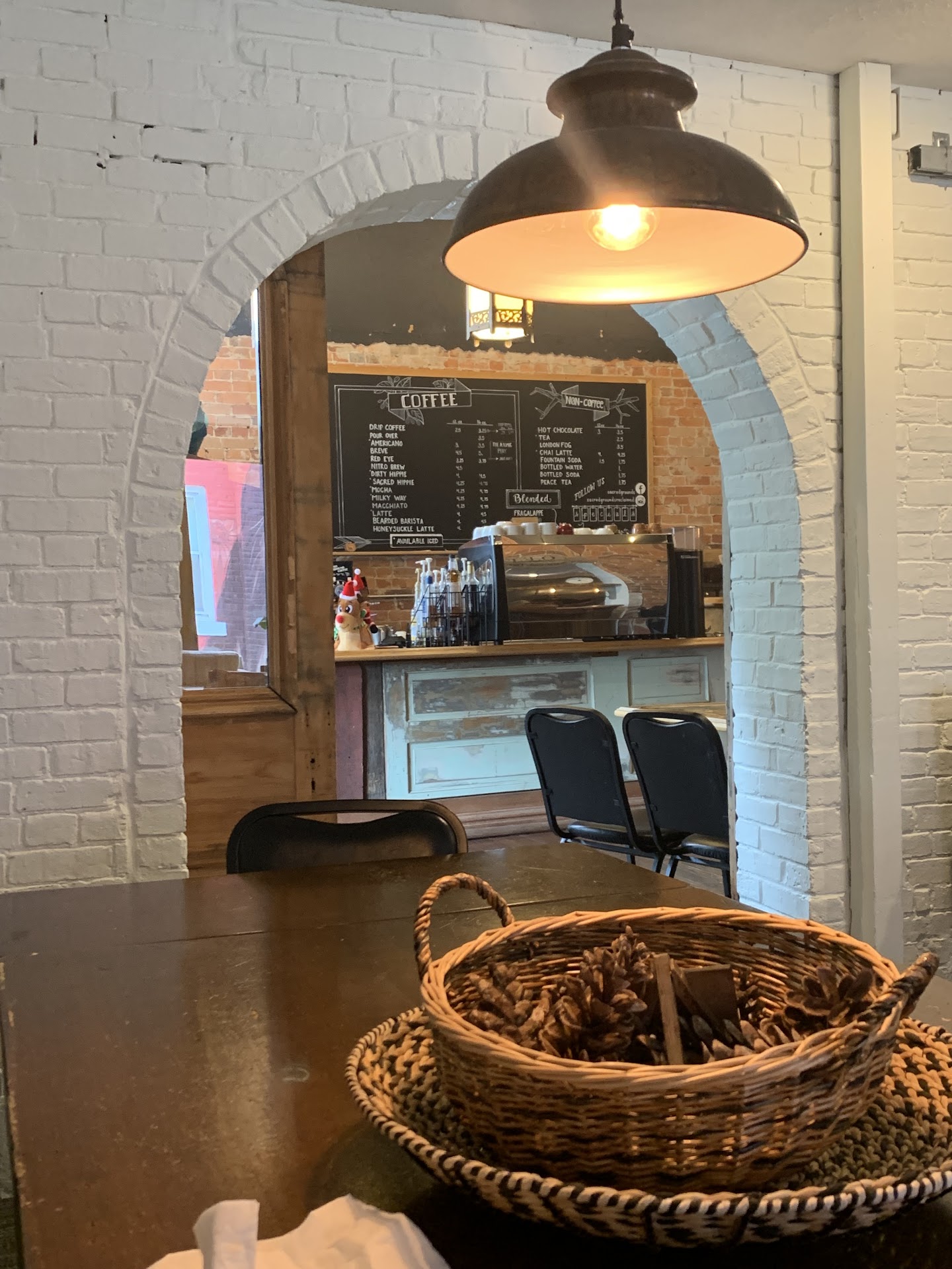 If you're looking for a place with a good "coffee house vibe" this place is great. It's got vaguely hipster decor that all good coffeehouses have-exposed brick, rustic repurposed decorations, Edison lightbulbs, vintage style stools at the coffee bar, the whole 9 yards. But there were also some interesting Christian touches- old pews that had been painted fun colors are used as seating at a few of the tables and Gothic revival pendant lights that look like they came out of an old church hang above the counter. It gave the place a touch of personality and saved it from being cliche.