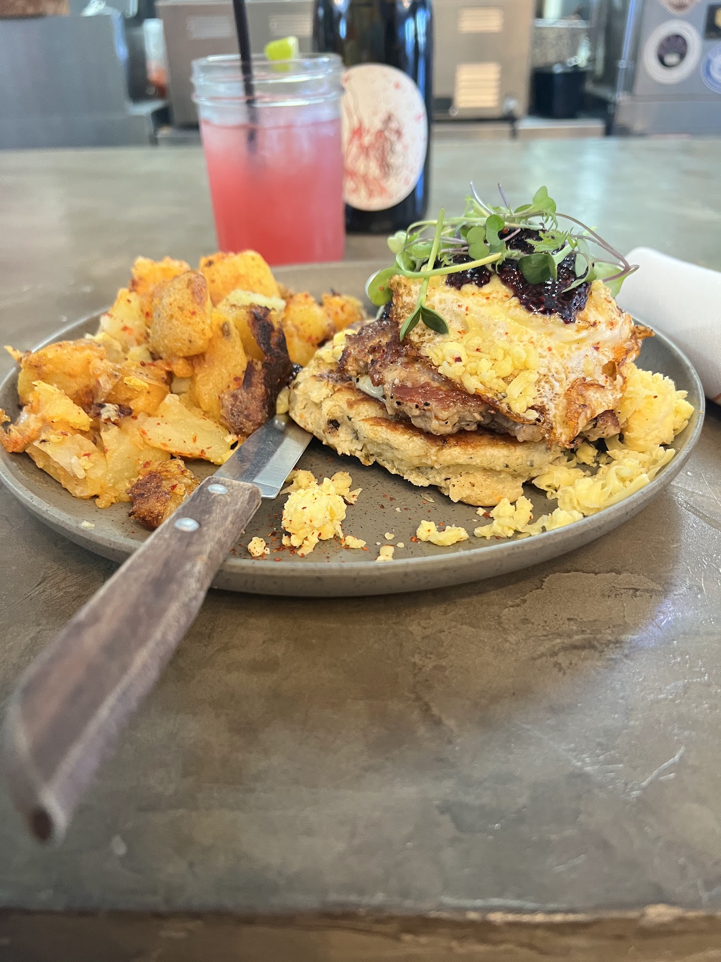 Read moreAtmosphere enhanced by the colorful and copious artwork; but food was heavy on indeterminate spicing and not showcasing the freshness that goes along with farm- to- table; otherwise good menu choices with vegan and vegetarian options. That said- asking to have a meat protein on a different plate from the vegetarian dish was too big of an ask- Waffle House does a better job. Grits were runny and not worth the effort to spoon them...nice micro greens but the amount was actually micro! the worst thing about this eatery was service. They do not accept reservations but have no reservation about making you vacate a table for someone calling from across town, arriving a half hour after you, when you’d have been done eating your mostly vegetarian meal. Which mostly wasn’t eaten because : When asked to replace an egg that had been snuggling the meat protein , eggs left and came back on a separate plate. Same eggs. Cold eggs. When asked to replace them , eggs left the building and were not replaced. Server says sign states no dishes replaced. It was eggs we wanted replaced not dishes, and anyway, said sign was not in sight anywhere. No manager, no chef, no one comes to check if they can make it right. Do not tip when paying before you get your meal. Waste of hard -earned money. By the way we had to vacate a table to get a table the same size but right next to the line to order and we’re it not for a kind soul offering to move, we’d have had to go outside. As it was we ended up pushing two tables together, and there was an empty one by them. Enough for the party coming later. What an...