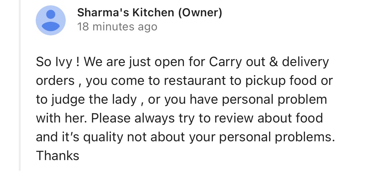 Here is more details: our family was a frequent customer of this place for couples of years before globe pandemic. Every time when there was a friend who asked or show interest in Indian food, my family will say go and try Sharma kitchen! The food is better than the ones that were located on campus and thatâs why we visited very often. However, the particular person, the lady whoâs at the checkout made us stop going. One time, my boyfriend and now husband was ASKED while we were eating that he should put the food scrap on his plate not on a napkin. I felt extremely embarrassed and this had never happened in any other restaurants ever. I do not think this is normal for someone works in a restaurant to do. Even though we were regular customers but weâd prefer not to talk about anything personal. Every time we just went inside and sit down for buffet. Pay and tip after eating, then leave. I even helped clean the plates by putting them organized for the waiter to collect, and prolly save the waiter some time when possible. however, the lady told me that a lotion from my home country smells good. I felt kinda awkward but I did say that if I had chance I would help her find them. Thatâs all the conversation. Long time passed, I had an emergency trip and I needed to travel overseas within a month or so. The next time I came back to eat, she said she havenât seen us for a while. I said I went back to my home country for a short time. She askedâ did you get the lotion for me?â Well......this really makes me feel embarrassed and I didnât know what to say. We did continue to go when my husband wanted to get Indian food until they charged extra for naan in buffet and later on the quality of food was decreased. Basically u can only eat rice after 1 piece of naan in the buffet. The last time we went, rice was full of clumps and oil floating on the chicken and the food didnât taste as good as last years. The worst was the food became more salty and we did not like that. Thatâs the moment I felt itâs time to say goodbye to this place even though my husband is a super fan of Indian food. Later on, we tried different Indian restaurants in Chicago, Indianapolis and Champaign area. All I can say was that this place was better than the economic buffet on purdue campus but below average of a great Indian...