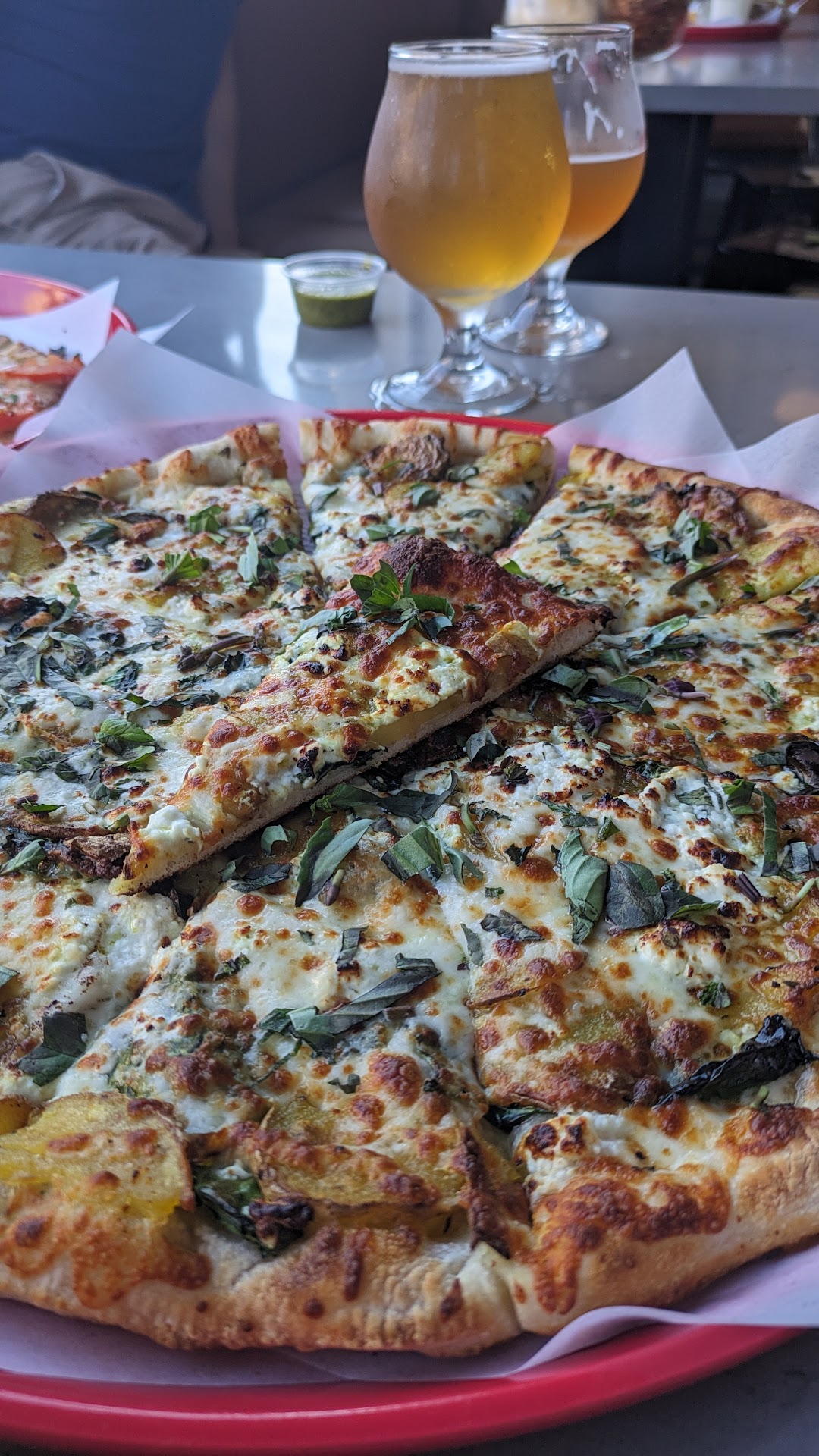 We arrived for an early dinner, around 5:30, and the restaurant was empty except for a lone booth occupied in the corner. So I was blown away when the chef, doubling as the order taker while his co-worker was on break, produced the best pizza I’ve ever had. We chose the pizza of the day: corn, zucchini, yellow onion, mozzarella, French feta — whatever that is — cilantro, garlic olive oil and lime. The perfection of this pizza and the way its flavors combined so brilliantly, suggested a food scientist had made it his master’s thesis. The thin crust was somehow crunchy and chewy simultaneously. The green sauce, darling of many reviews, is as good as fans say. And the salad of the day — greens with berries, feta and a slightly sweet dressing that the order taker/chef described as “strawberry blueberry” except it was almost completely white — also exceeded my expectations, in the best way. My only regret is that we ordered a half a pizza— $15 and worth it — and finished it all, so there was nothing left...