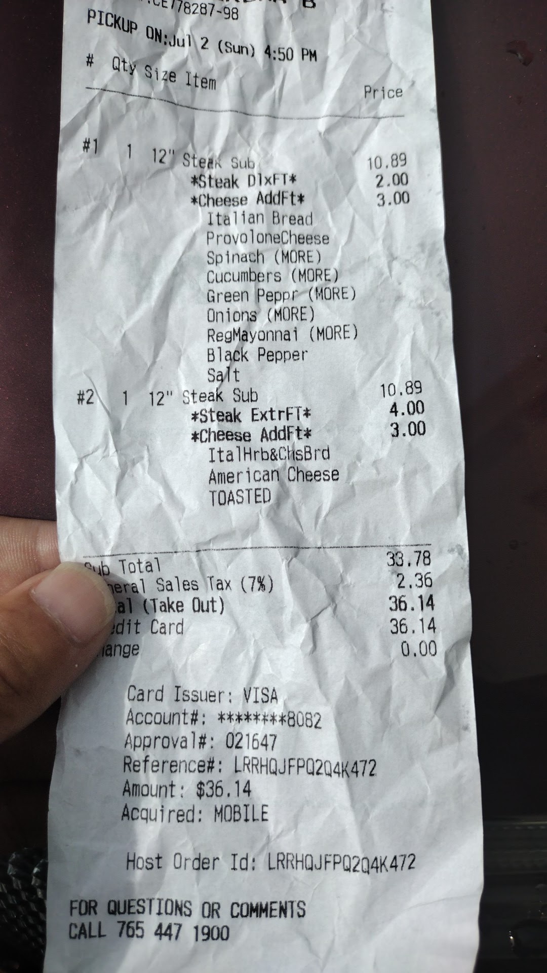 Read moreI would have given it a zero star but obviously you have to put up a star in order to get a review on here. Me and my wife decided to order to Philly. I walked in my Philly cheesesteak was toasted. Which my sandwich was toast no problem my sandwich was good. My wife didn't want her Philly cheesesteak toasted. So they went ahead and prepare the sandwich with all the vegetables and through on Frozen cold steak and made the sandwich. I went back into the store to let him know that my wife wanted her stake heat it up like any of the Subway franchise does. The two young kids barely legal told me that that is how the steak is made because she didn't want it tosted. Obviously I asked them how long have they been working for this franchise anyone that orders a Philly cheesesteak the state is always heated before the customer your order. Things got heated and they decided to call the cops on me and told the cops I was trespassing. Long story short I had to leave with my cold Philly...