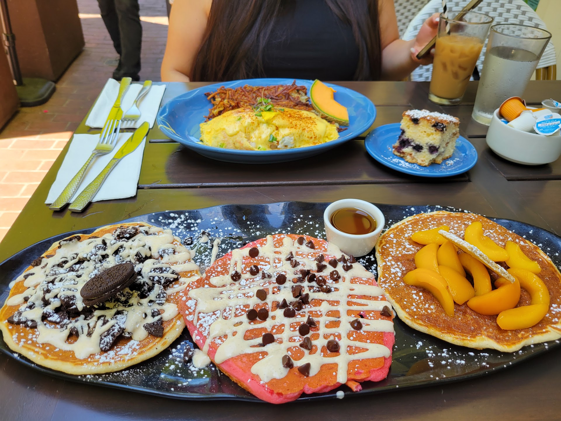 Anyway, my date was running late, and I told the hostess that I wanted a table outside so I could set the vibe. No problem, but it's a 25-minute wait. Ok cool. We got our table a little early actually (kudos), and got our water and menus. The server gets our orders and everything is going well. I ordered the trio pancakes and my date ordered the Crab Cake Benedict. The food was delicious, no question about that.