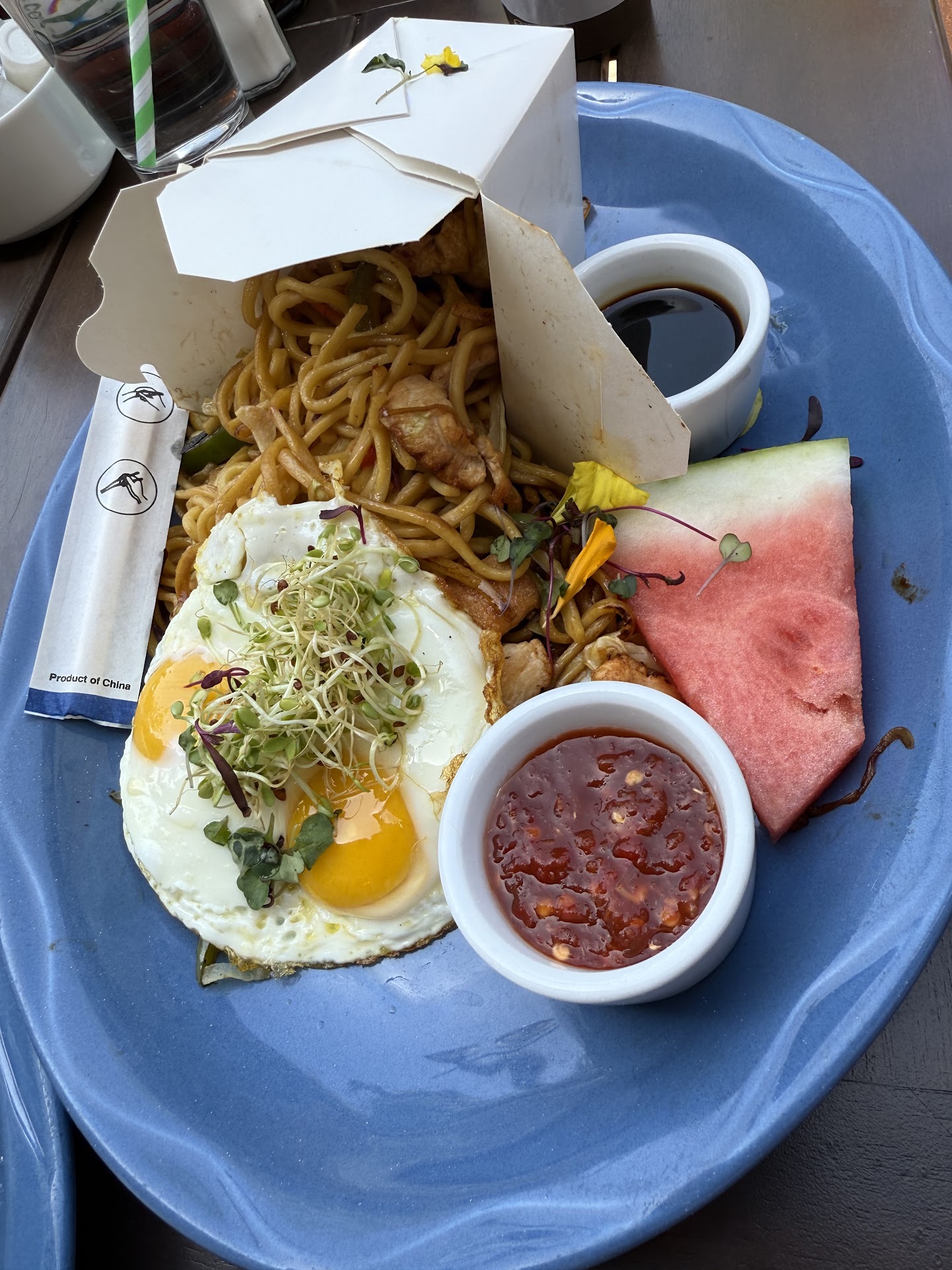 But the tofu scramble tasted very bland, and I've had many tofu scrambles in my life. I know they can be delicious. I also had a "Midtown trio" meaning I sampled three pancakes and/or French toast. The raspberry ricotta French toast was delicious and I would get it again if I somehow ended up here again. But both pancakes I got (blueberry lemon ricotta and the peach cobbler) tasted of excess baking soda. The hash browns that came with the tofu were fine but nothing to write home about. 3 out of 4 "main" items not being very good is not a good success rate.