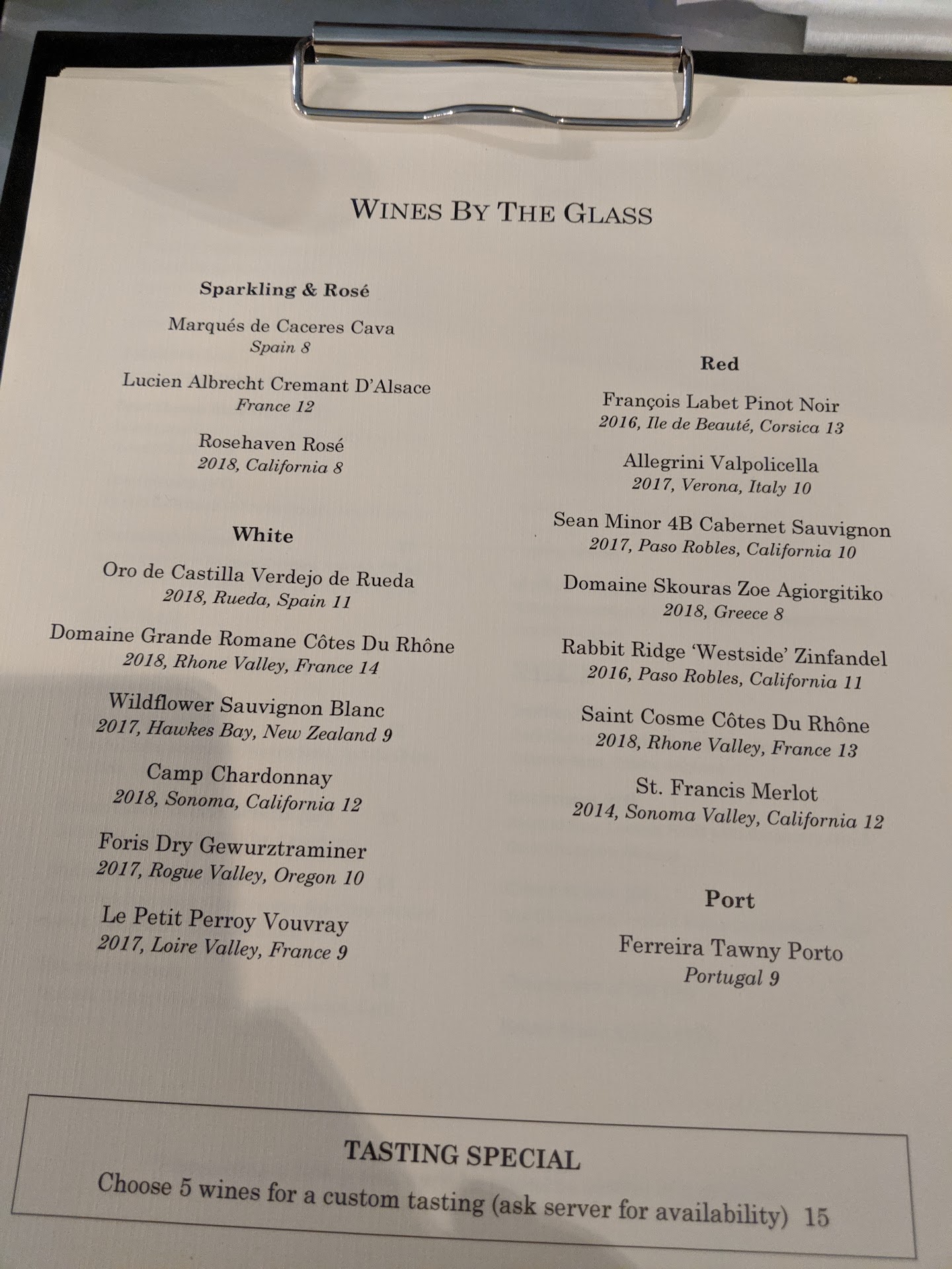 Eventually we were seated, our IDs were checked, and we ordered a bottle of wine. The wine was delicious, but the missing wallet fiasco really soured the entire experience. At 29 years old, I would never expect to be accused of trying to buy alcohol underage, especially being that I had been clear and up front from the get-go that I had forgotten my wallet - it’s not as if I had tried to order first, we had just sat down and didn’t even have water at our table yet.