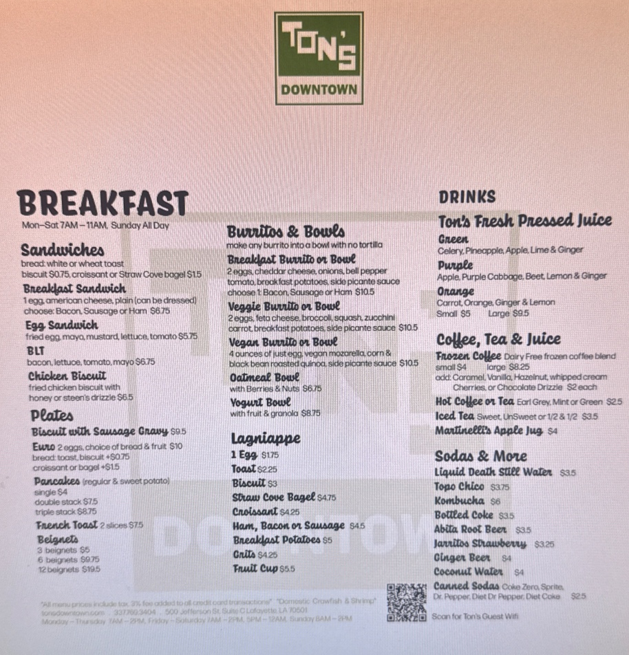 Read moreGreat Downtown Lafayette spot! My family and I meet at Ton's every Wednesday morning for breakfast (I make more visits throughout the week). We love that Ton's opens early enough for our family to have time together before we all go to work. There is plenty of off-street parking with their private lot right next to the restaurant. My mother has accessibility issues, so having a close spot is nice. The quality of the food is always high and the service by their team of friendly servers and cooks makes our experience much more meaningful. The variety of items always satisfies, whether I'm keeping it light with coffee and fresh pressed juice, or filling up with the vegan burrito. We always feel taken care of when we go to Ton's. I recommend that everyone...