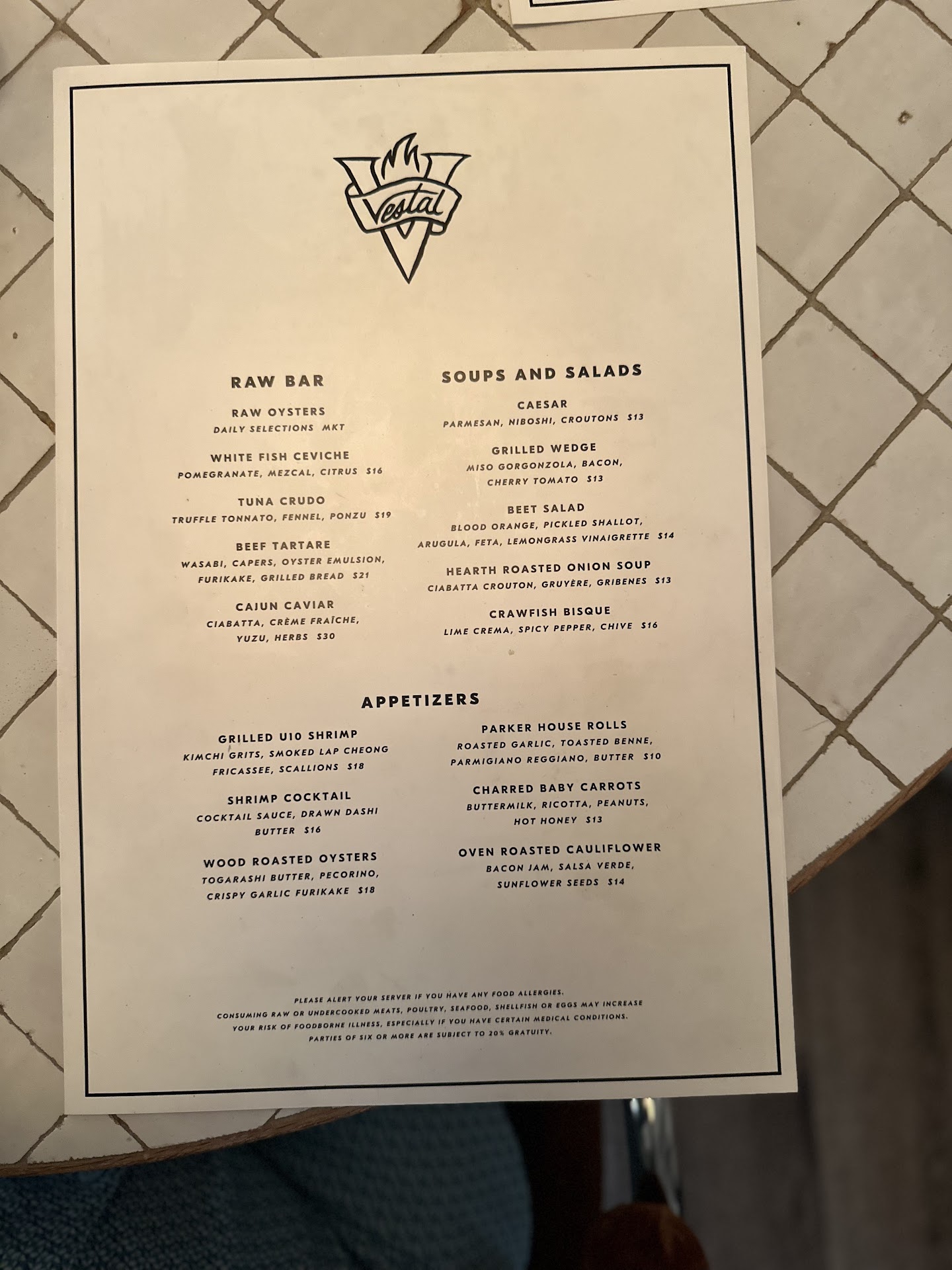 Overall, Vestal exceeded our expectations in every aspect - from the food to the service to the ambiance. I am so glad I found a spot in Lafayette where you can eat both delicious and safely prepared tartare. If you're looking for a fantastic dining experience, Vestal is the...