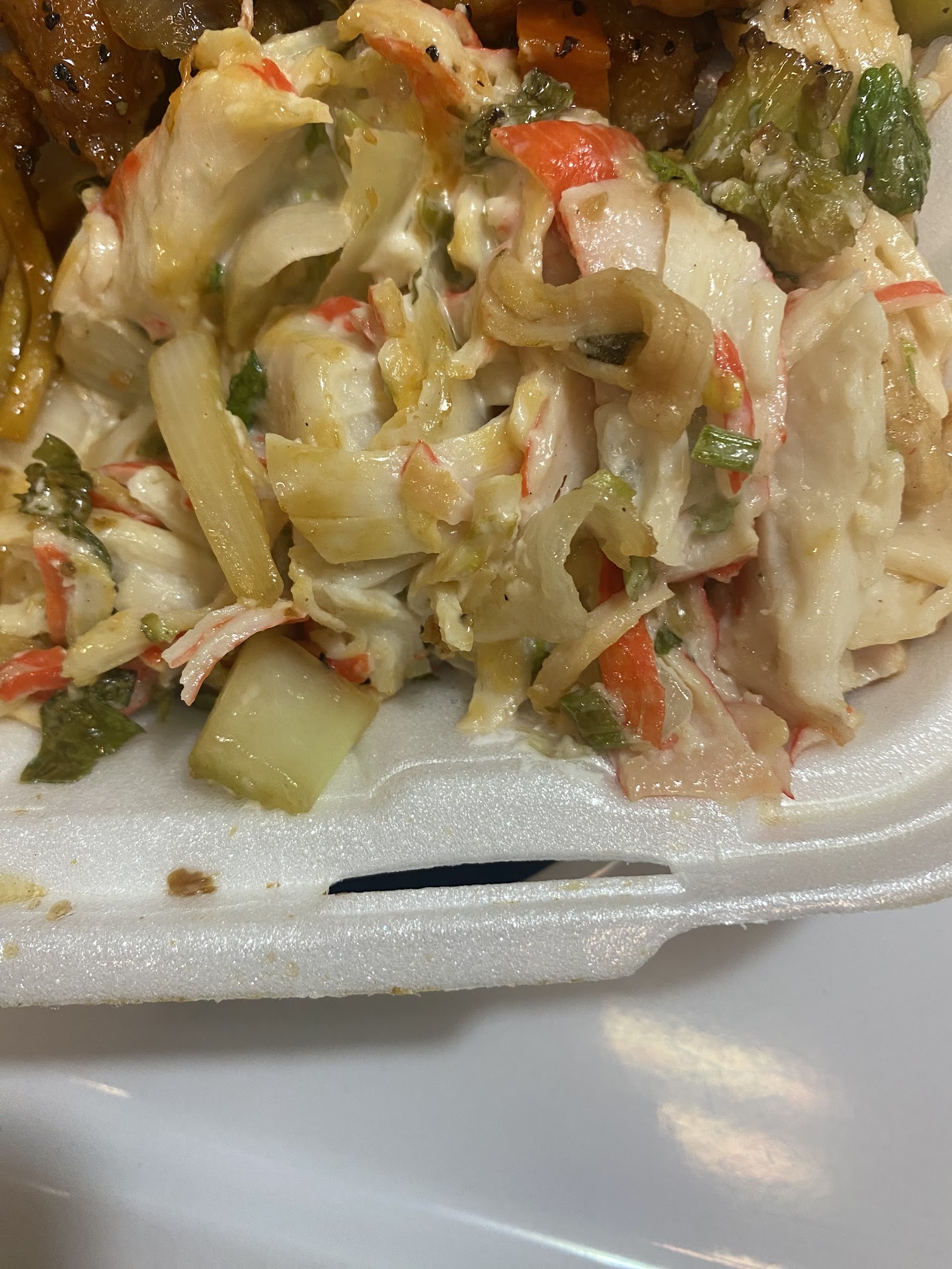 I got my usual crab meat ,veggies & and teriyaki chicken . Upon eating the crab meat, there was a bug. Smdh, it wasn't a roach it was something that had a stinger on it wings and was black .