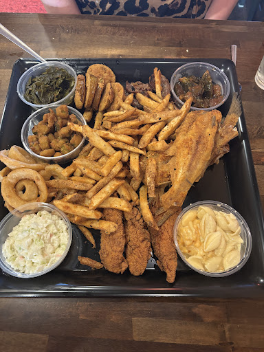 Read moreThe location and atmosphere was great. I ordered the single catfish filet with cheese grits and okra. The okra and hush puppies were really good. The cheese grits were too dry and the catfish breading had been cooked too much—not the golden brown seen in other pictures on other reviews. The server brought the food out with no utensils and never checked on us again when having one in our party who ordered the all-you-can eat catfish that comes out with only two filets—a plate on the menu priced $4 cheaper— or to refill our drinks. By the end of our meal tables were empty too. We had to walk to the front to get our bill to pay and leave, disappointed to say the least. We should have eaten at Oink Joint (which we have and enjoyed much better) were my thoughts...